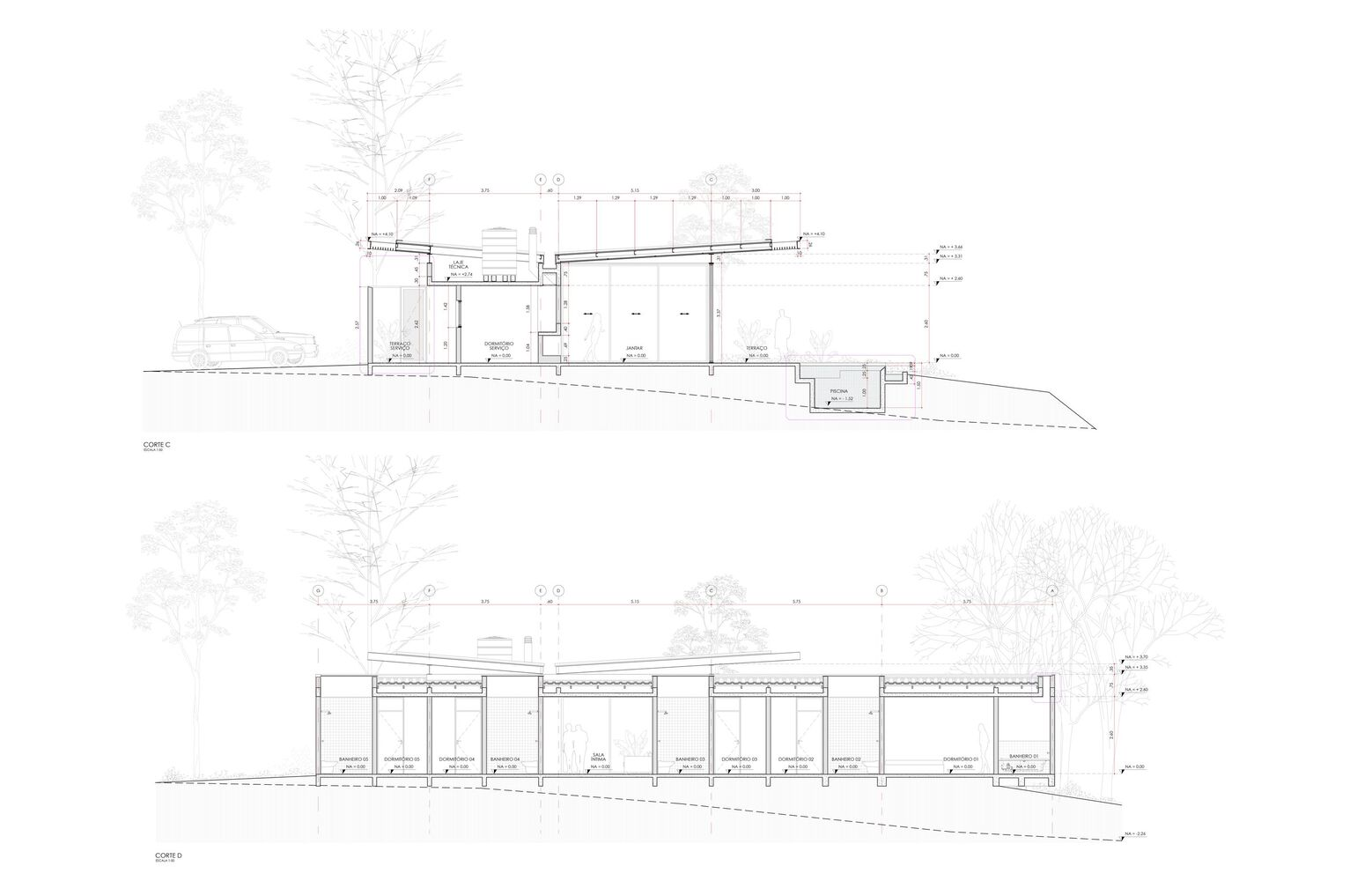 A standout feature of the Manacá House is its metal roof, which not only serves as a critical structural component but also as a visual connector between the house’s two primary volumes. This roof extends over the social areas, creating expansive eaves that shield the interior from the tropical sun, while enhancing the vertical space within the social gathering areas.