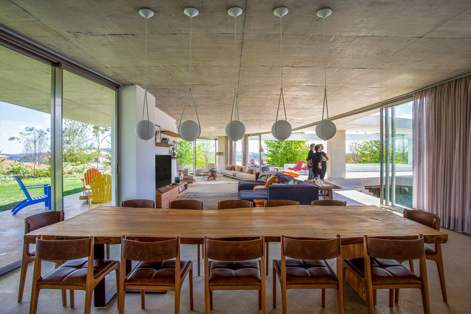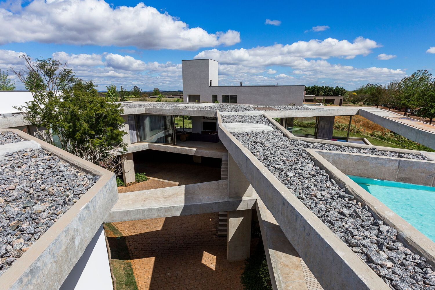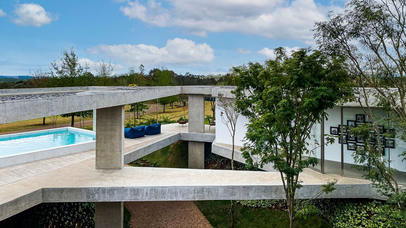 A hallmark of modern concrete architecture in Brazil, the Subtraction House blurs the lines between indoor and outdoor spaces. Vast terraces extend from the living environments, fostering an intimate connection with the surrounding landscape. The contrast between the concrete slabs and the white-painted masonry interiors accentuates the residence's minimalist aesthetic, while the strategic positioning of the pool softens the concrete's rigidity, reflecting light and adding serenity to the atmosphere.