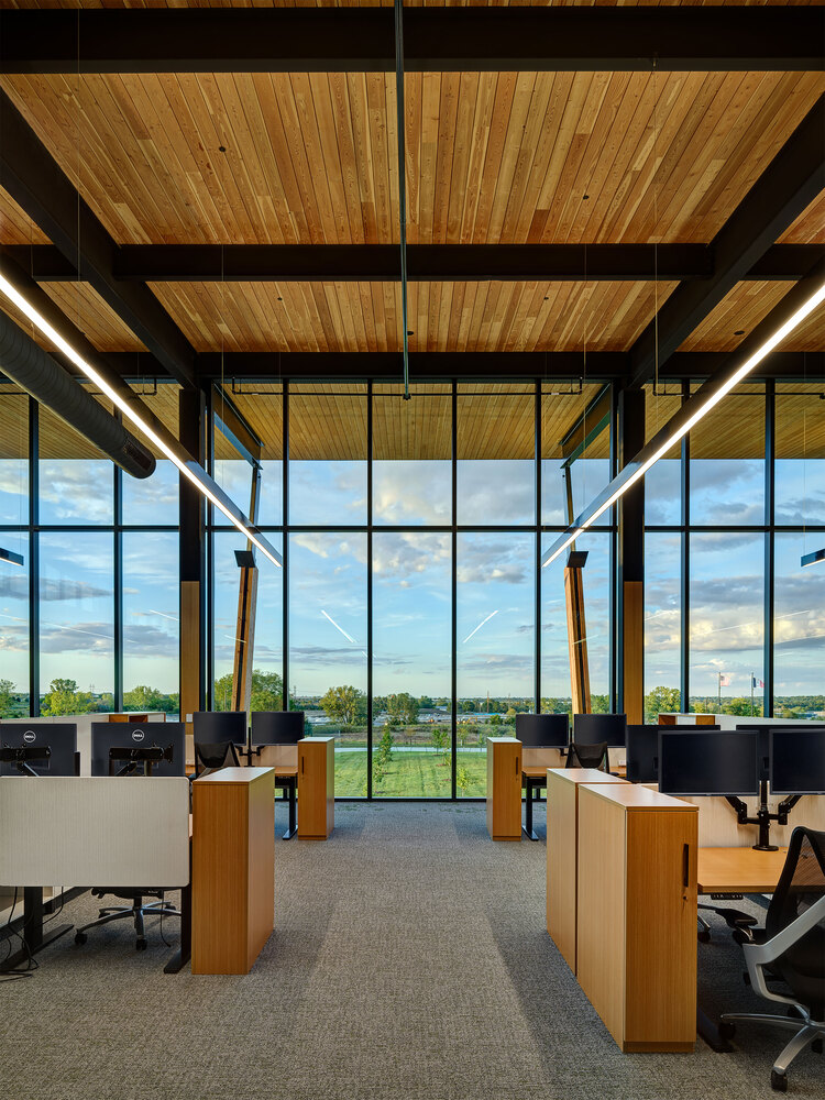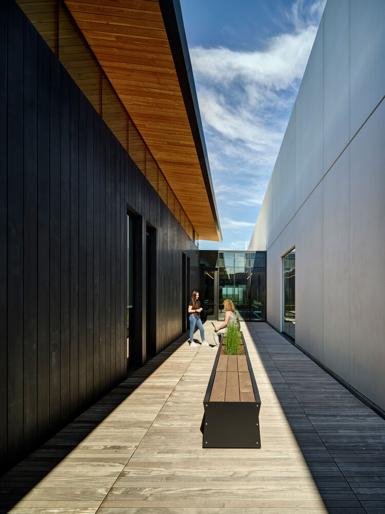 Material choices balance innovation with a grounded pragmatism reflective of Midwestern values. The office is framed in steel with laminated wood decks, while the exterior combines a black metal rainscreen and precast concrete panels to delineate different functions without visual separation.