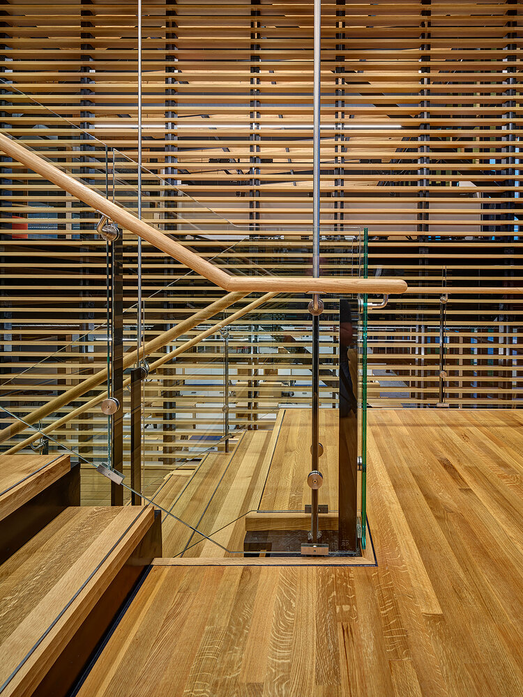 Here, a dynamic central stair — sculptural and functional — becomes a stage for all-hands meetings, spontaneous conversations, and cross-departmental interaction. It’s more than a design element; it’s a gesture of organizational transparency and openness.