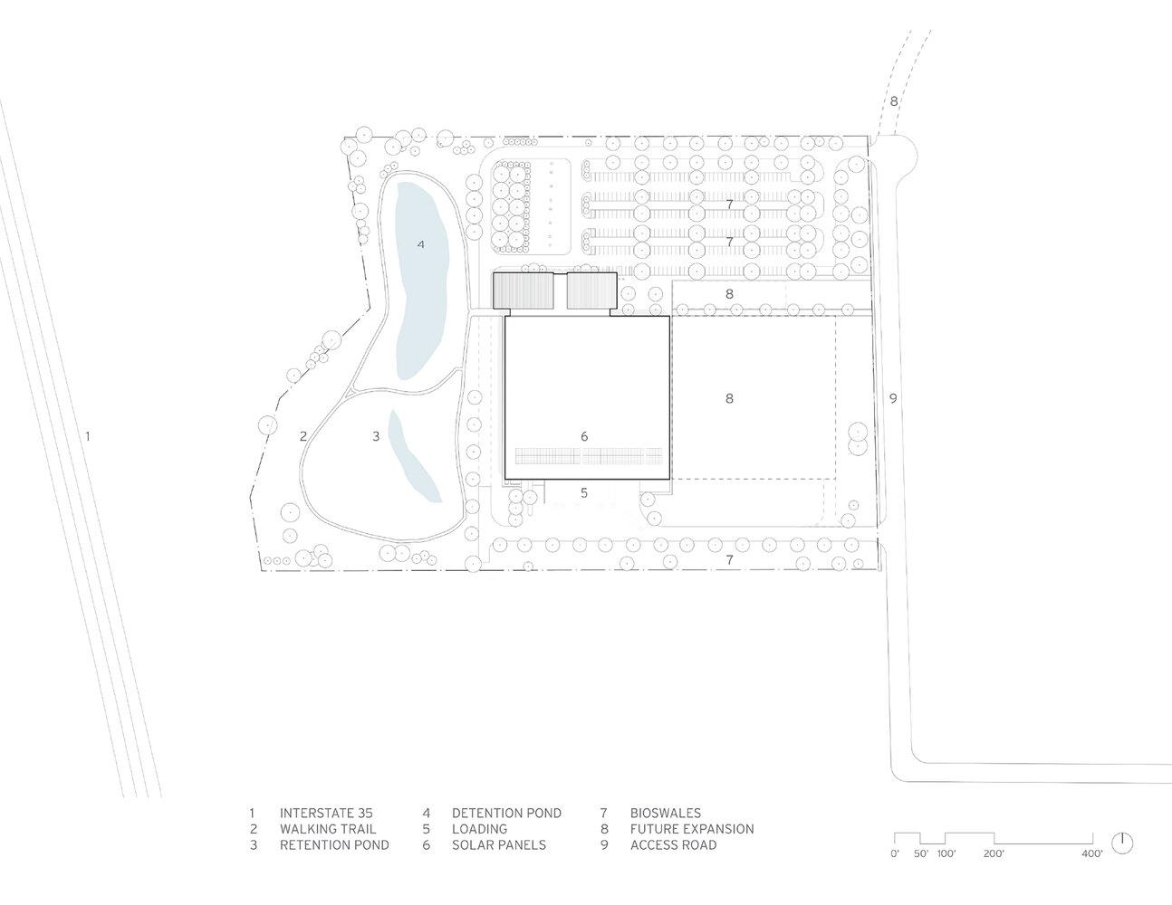 The project strategically unites a 50,000-square-foot office with a 105,000-square-foot manufacturing facility on a sustainably managed 25-acre campus. Designed to accommodate future expansion, the master plan emphasizes modular growth while reinforcing the company's commitment to operational agility. Instead of isolating functions, the architecture blurs distinctions between departments, dissolving traditional silos and creating a unified corporate ecosystem.