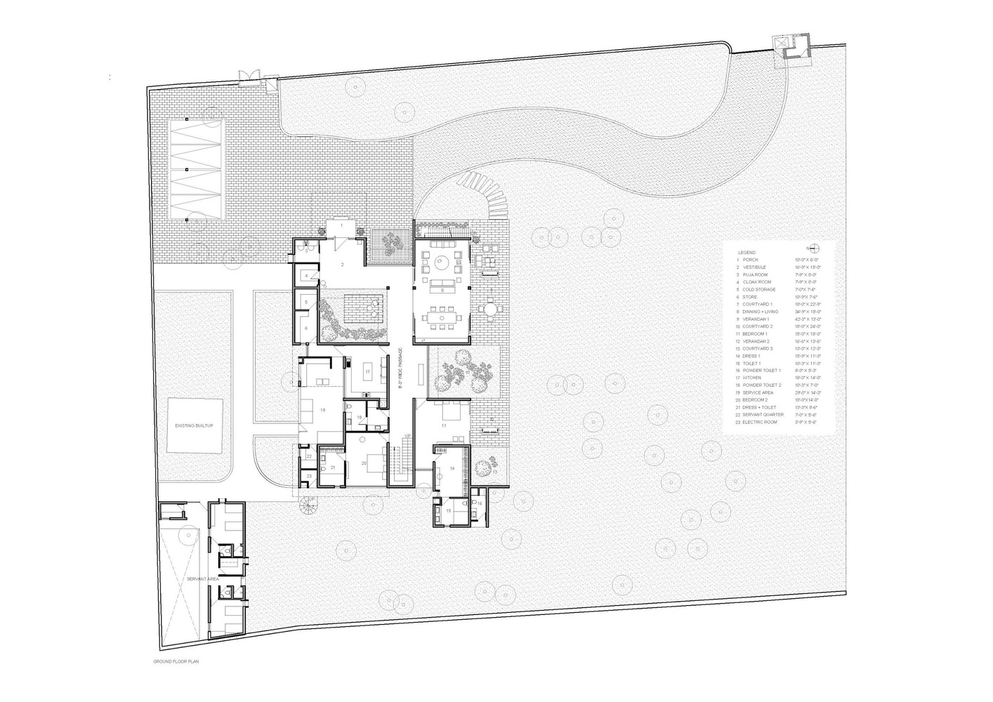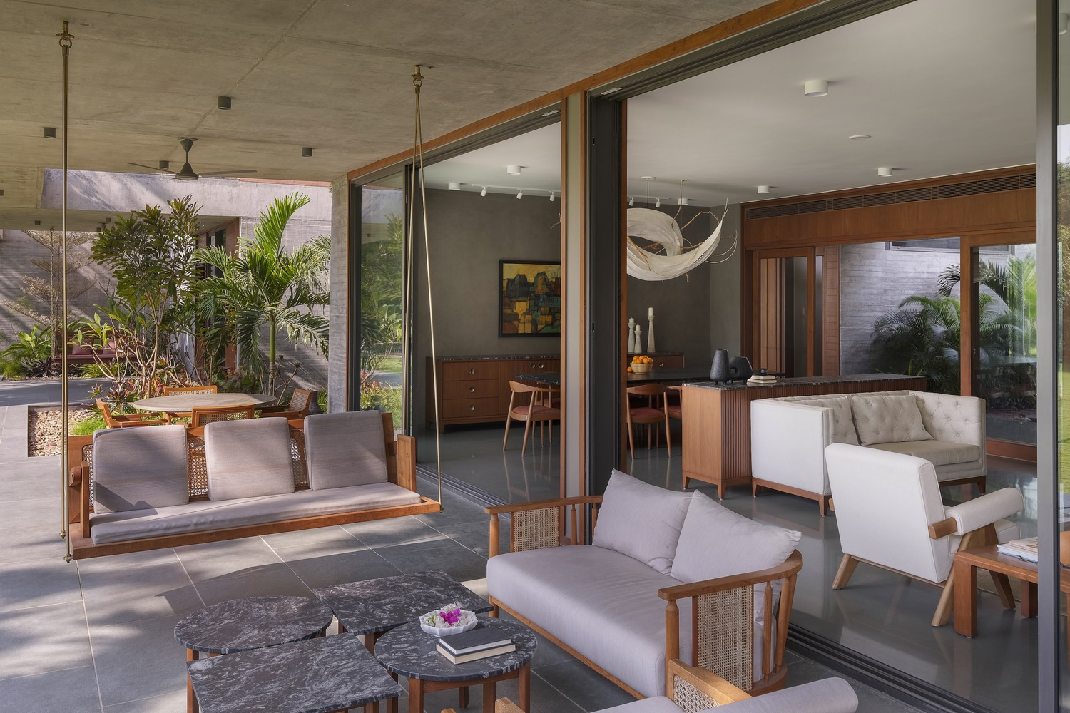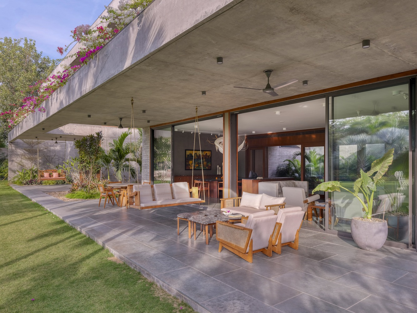 One of the standout features of modern courtyard house design is the seamless transition between indoor and outdoor spaces. The Aranya House exemplifies this principle through its open verandahs, verdant landscapes, and the thoughtful orientation of rooms towards the garden, inviting nature into the very fabric of the home.