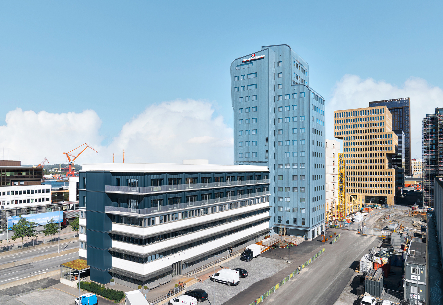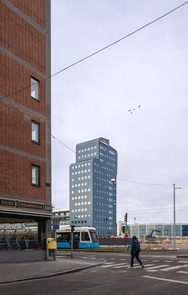The Stuveriet Office Building stands tall in Gothenburg's Masthuggskajen district, a vibrant area that blends the old and new aspects of Swedish urban life. Designed by Erdegard Arkitekter, this office building boasts a distinctive silhouette that rises 16 stories in the air, clad in thunder blue sheet metal. Its design embraces irregularities, with many corners and edges that curve upward, creating a dynamic and fluid shape that is both modern and functional.