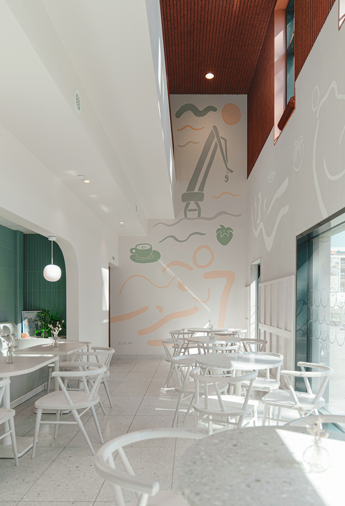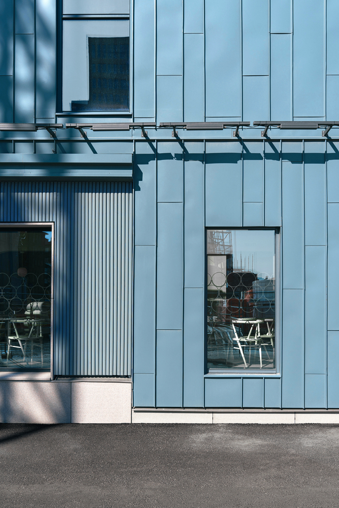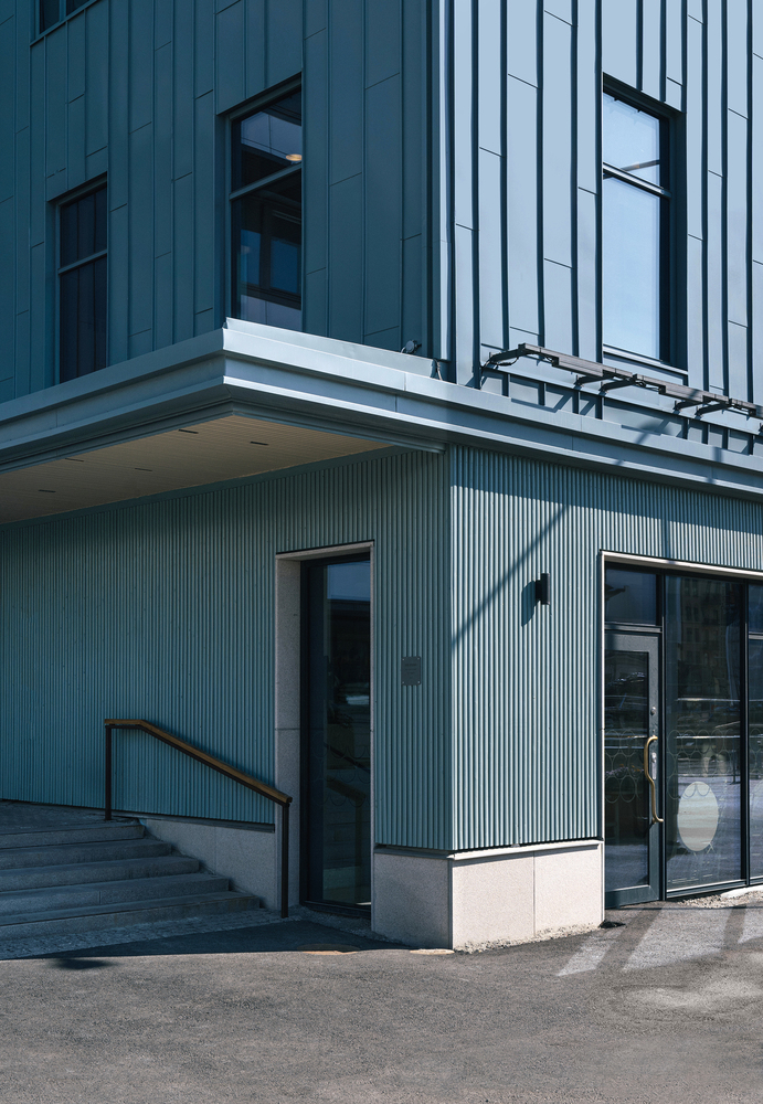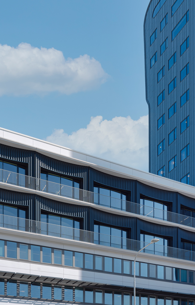 In contrast to the cool tones of the exterior, the lower floors of the building provide a welcoming and warm atmosphere. The entrance lobby houses a café open to the public, creating a sense of community and inviting everyone to experience the space. The red roof of the café is a nod to the industrial past of the port area, where rusty cranes and tin roofs were once common sights. This thoughtful use of color not only reflects the history of the site but also brings a lively and celebratory atmosphere to the building’s design.