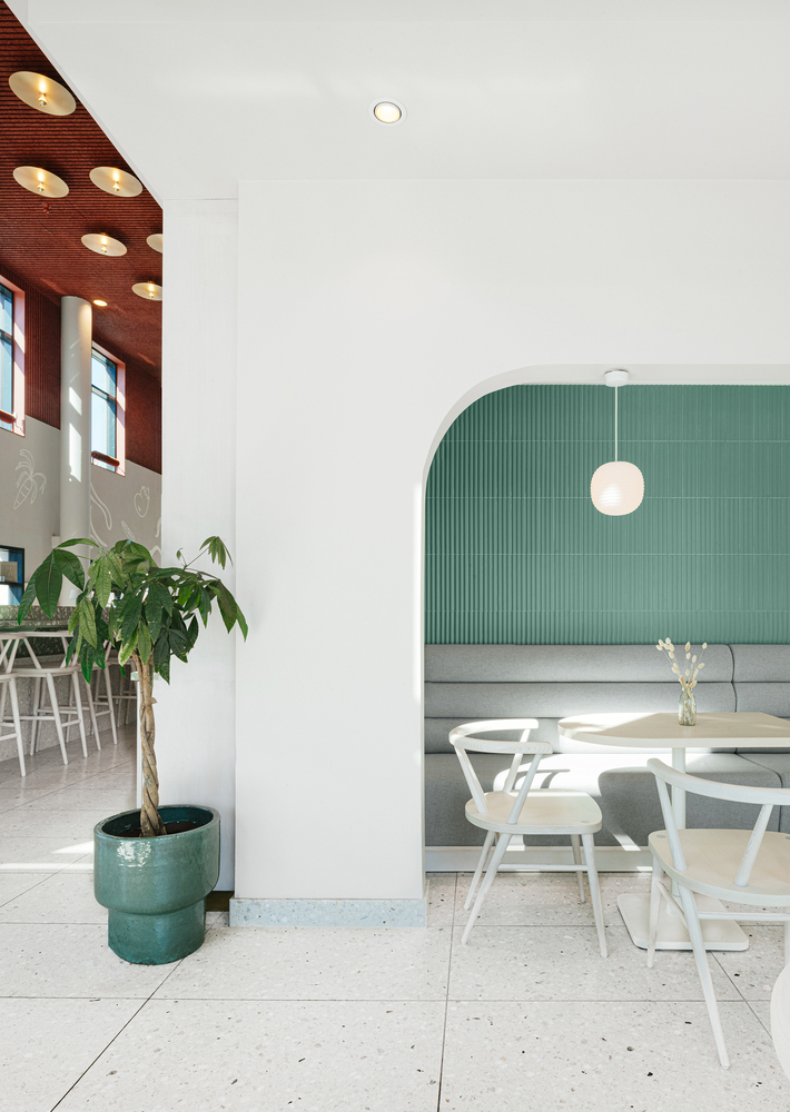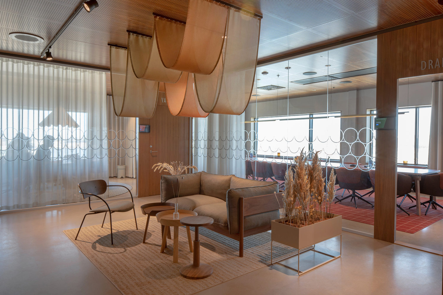 The ground floor of the building is dedicated to creating an open, public environment. The café, with its red roof and cozy ambiance, is designed to be a gathering place for both tenants and the public, fostering interaction and a sense of belonging. The use of wood fiber panels in the ceiling and walls provides an acoustic advantage, making the space feel warm and inviting while reducing noise levels.