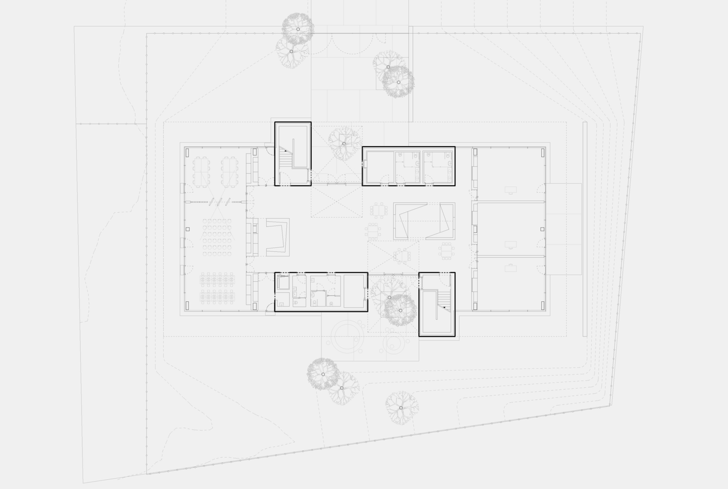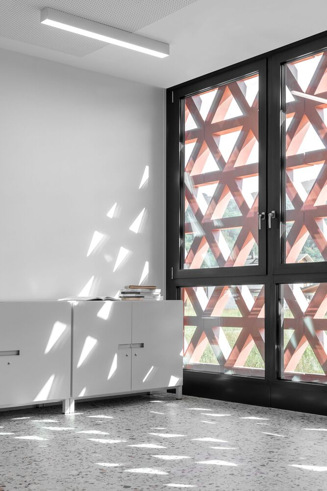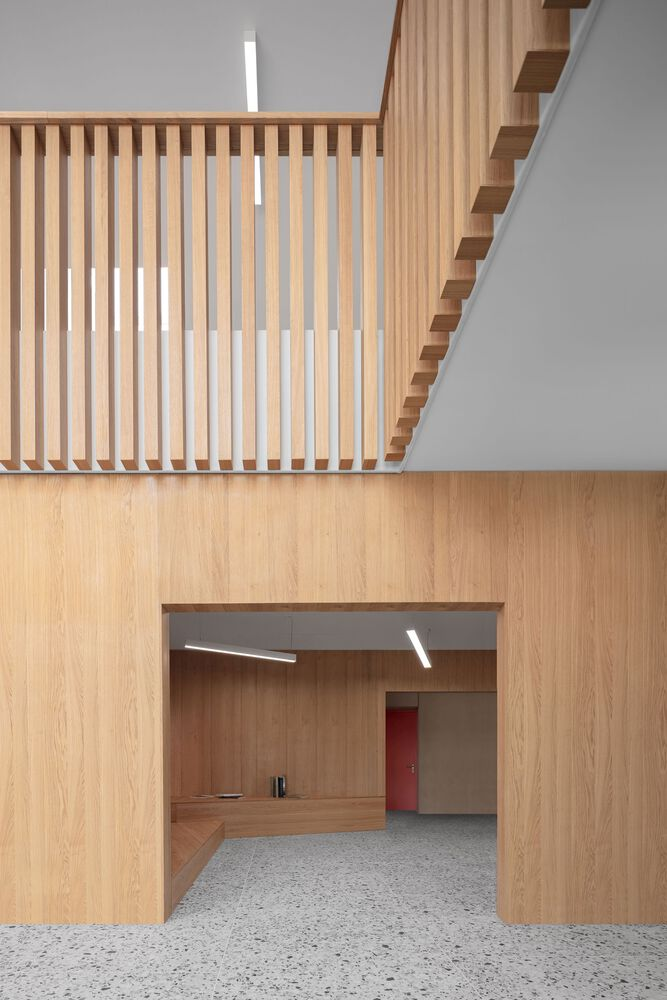 The interplay of materials further reinforces the architectural vision. The concrete volumes are punctuated by warm wooden elements, which define key spaces such as the reading room and administrative offices. This combination of materials balances robustness with warmth, creating an inviting atmosphere conducive to both focused study and informal interaction.