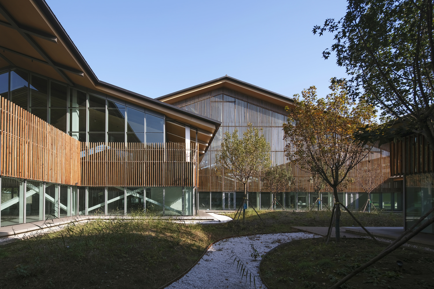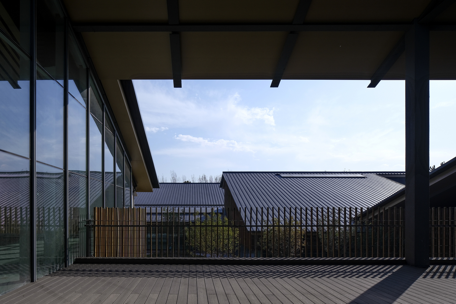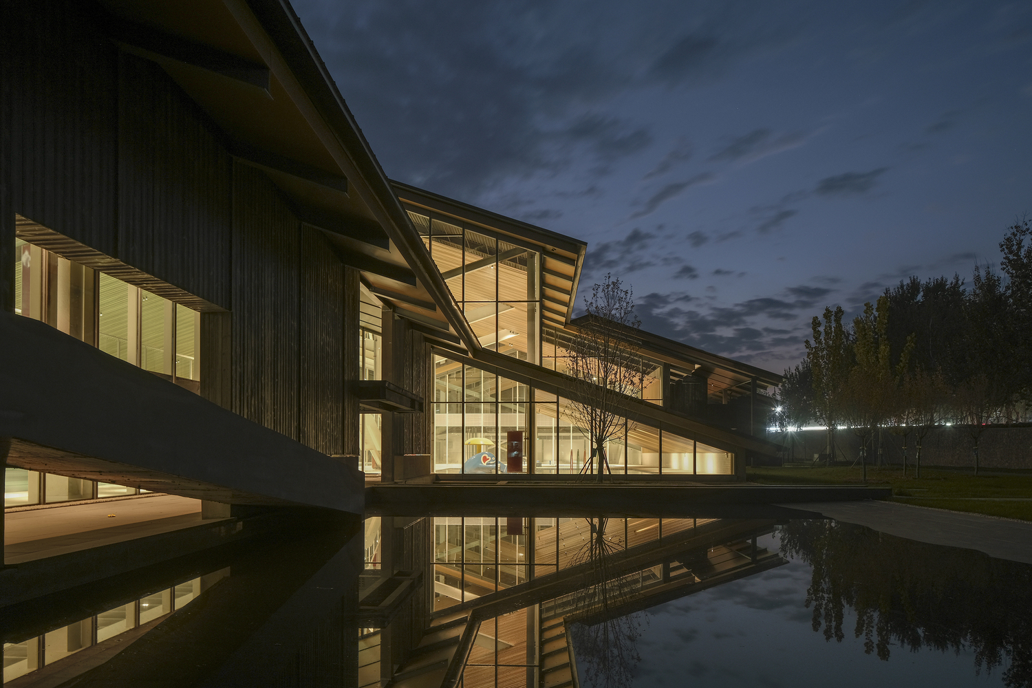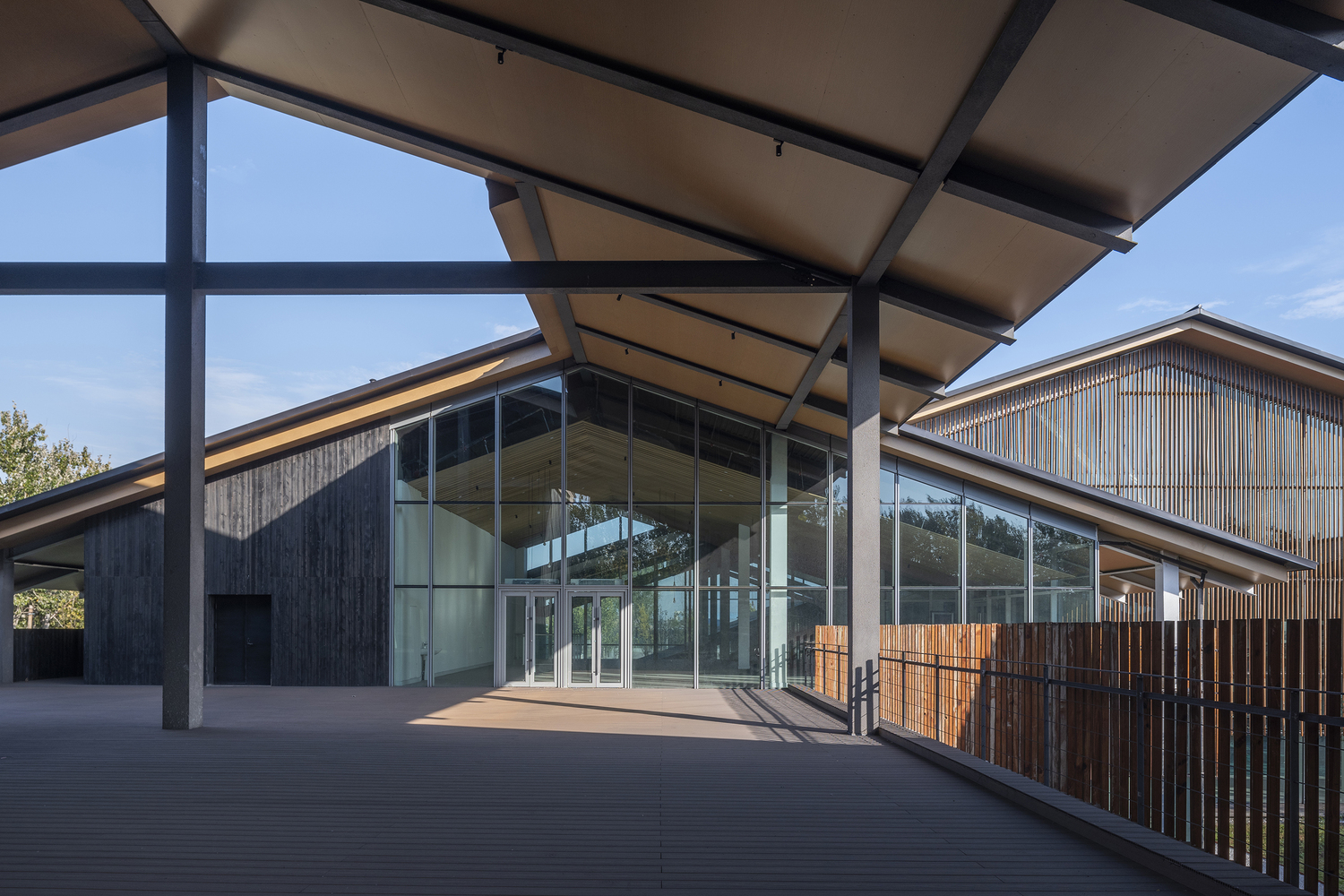 - Roof and Façade DesignThe reflective zinc-manganese roof and skylights evoke an industrial aesthetic, juxtaposed against the warmth of imitation wood grilles and black burnt slabs.These materials create a striking visual contrast, bridging the site’s industrial history with its modern purpose.