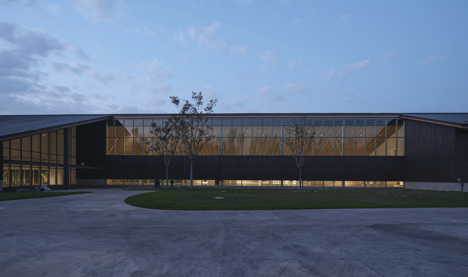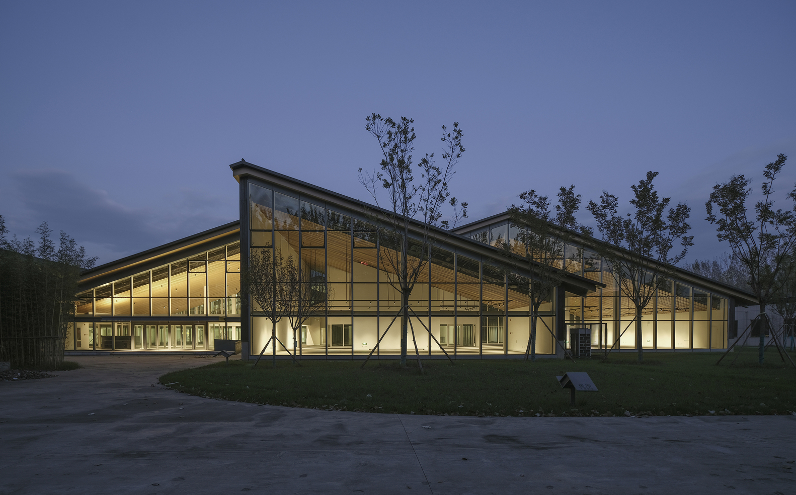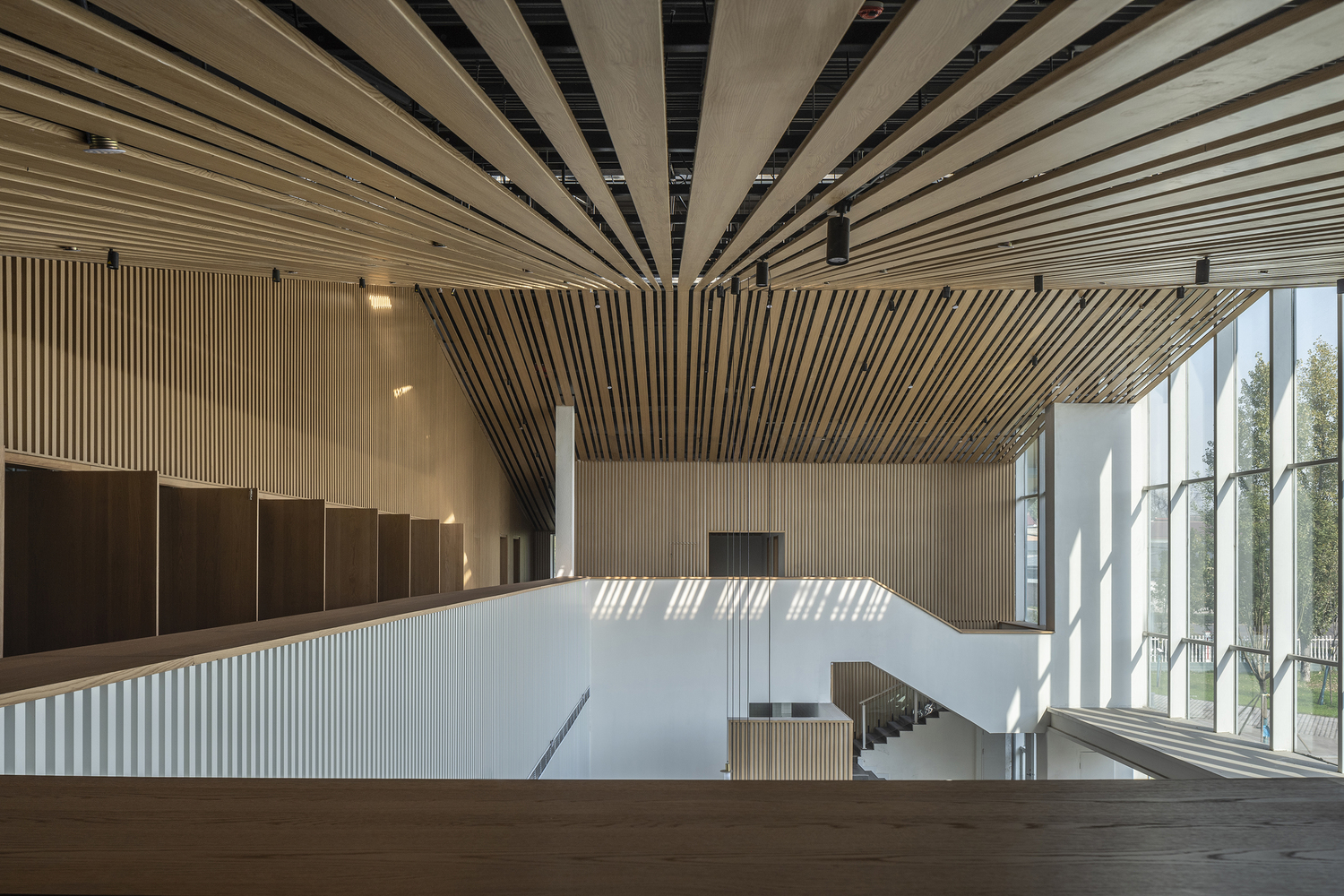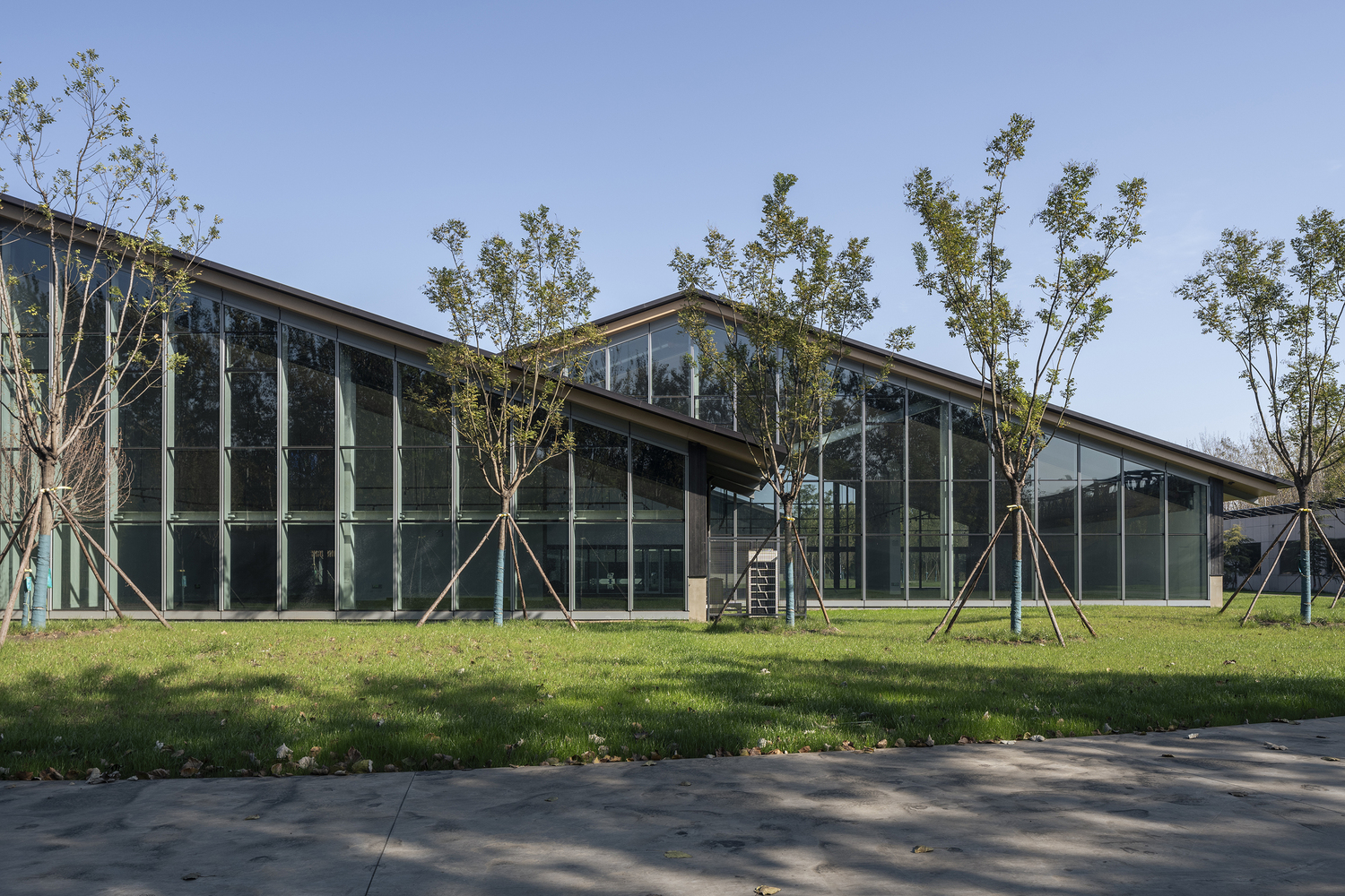 - Roof and Façade DesignThe reflective zinc-manganese roof and skylights evoke an industrial aesthetic, juxtaposed against the warmth of imitation wood grilles and black burnt slabs.These materials create a striking visual contrast, bridging the site’s industrial history with its modern purpose.