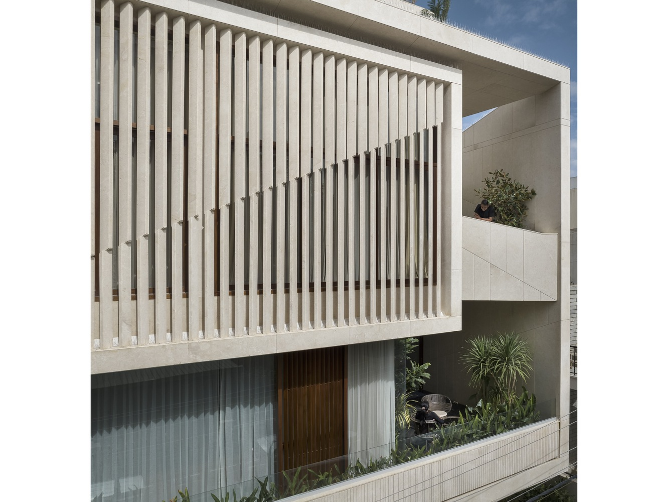 The exterior of the Wedge Villa is designed to resemble a chiseled block of stone, presenting a bold and contemporary aesthetic. This angular geometry is highlighted by the syncopated rhythm of vertical ribs across the facade. These ribs play a critical role in controlling sunlight, reducing the harsh glare while allowing soft, diffused light to filter through the structure. This design technique is an essential component of modern villa architecture, where the harmony between light and shadow contributes to the overall mood of the space.