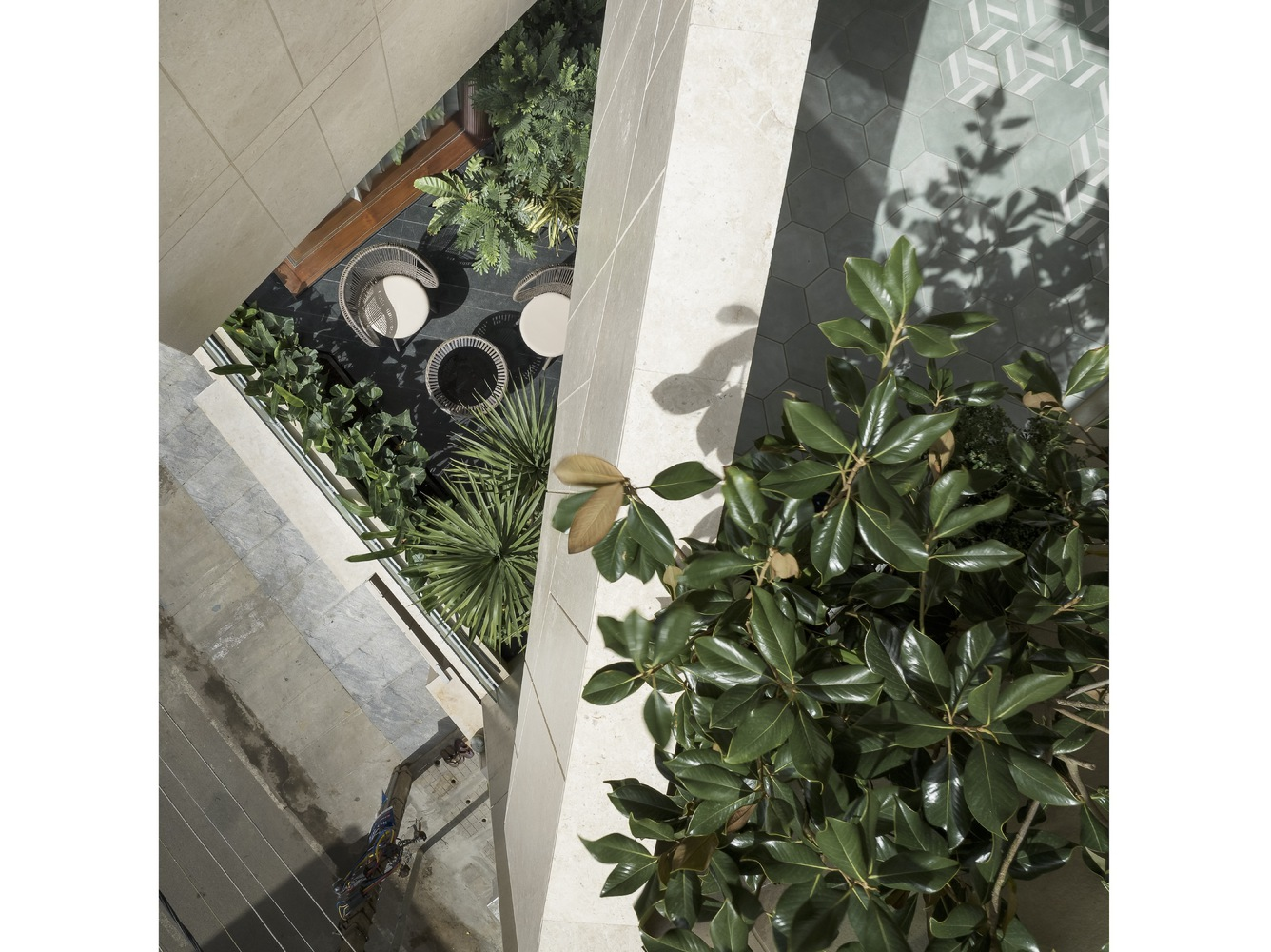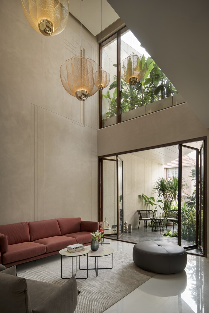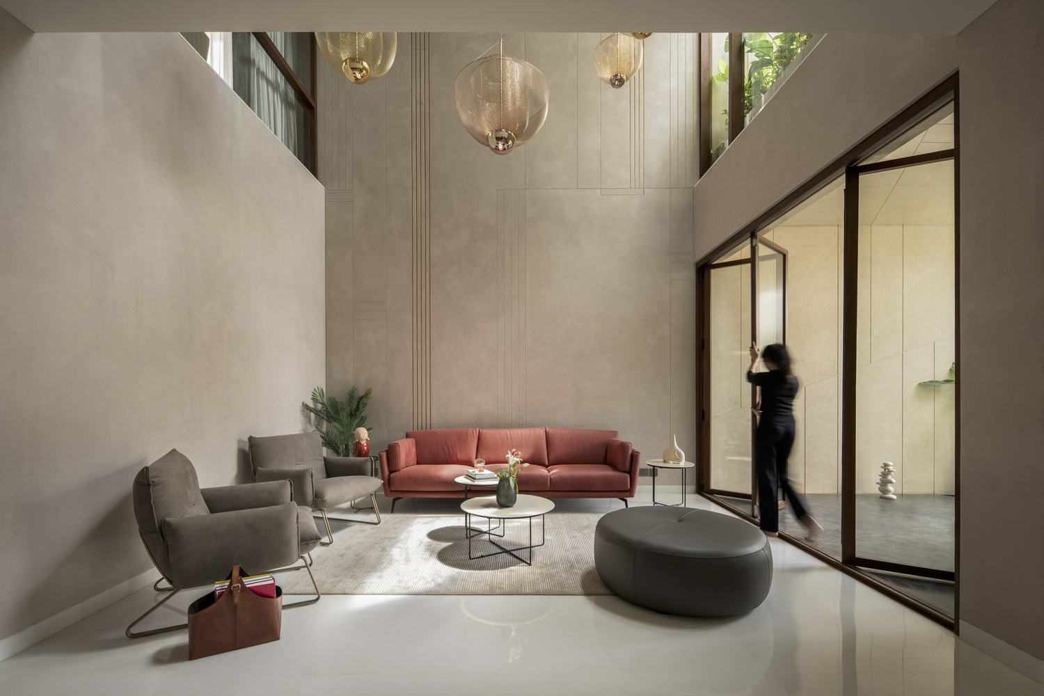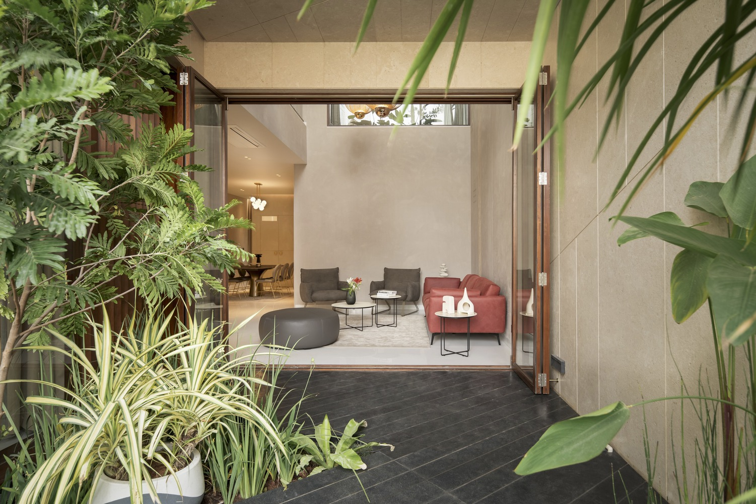 The first floor of Wedge Villa is where the home truly begins to showcase the concepts of modern villa architecture. This level includes a double-height family space, a formal living room, a kitchen, and a dining area, all of which are designed around a central green deck. The green deck is an extension of the living space, blurring the boundaries between the indoors and outdoors. It creates a serene, green oasis in the heart of the home, allowing residents to enjoy nature without leaving the comfort of their home.