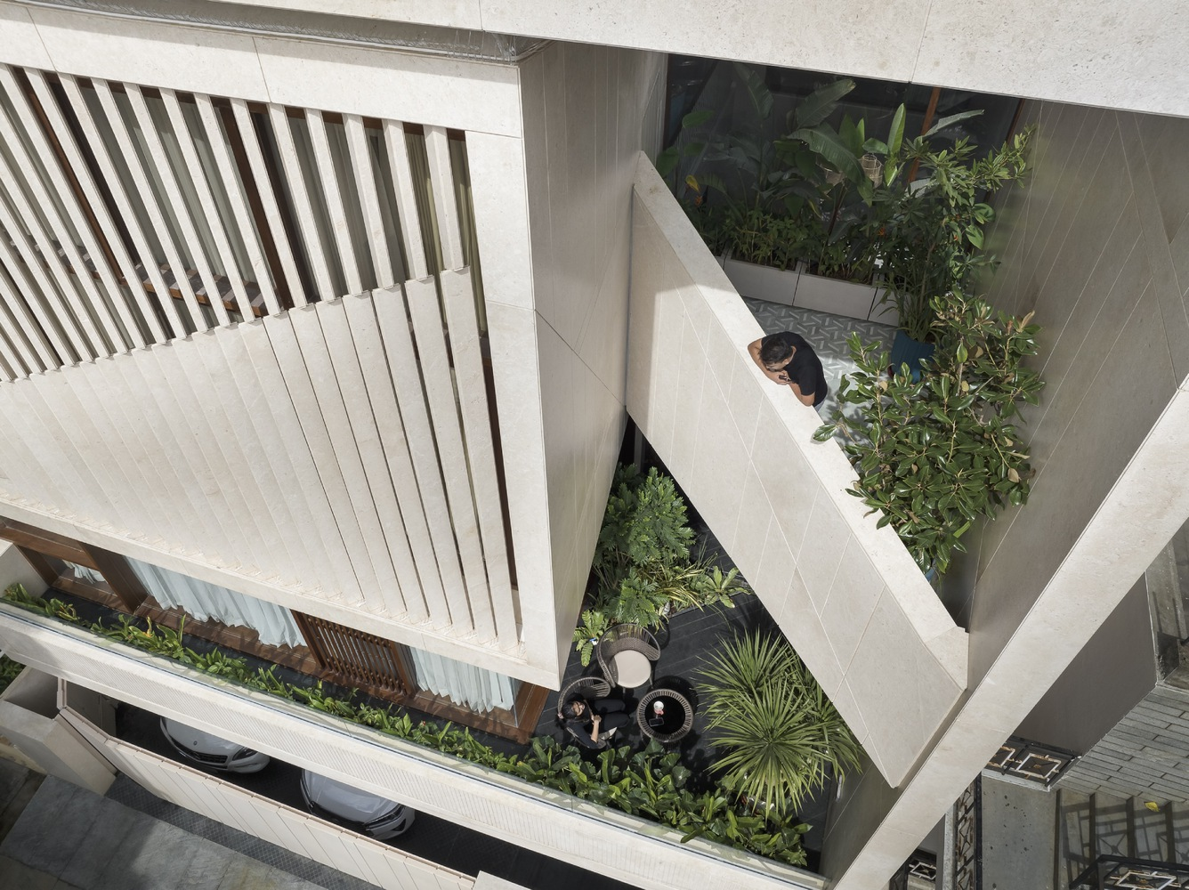 The upper levels of Wedge Villa house the four private bedrooms, each offering an elegant and tranquil retreat. The bedrooms are designed to maximize natural light and ventilation, providing a peaceful sanctuary for the family. A multipurpose space spills out onto a shaded deck, providing additional areas for relaxation or entertainment.