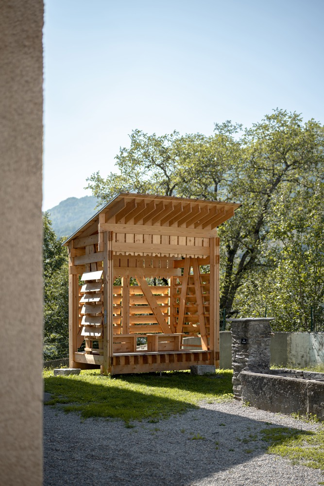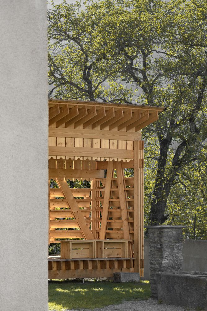 The careful arrangement of the planks reflects a vernacular spirit, drawing inspiration from traditional construction methods while maintaining a contemporary aesthetic. The installation’s modularity and adaptability make it a timeless addition to its environment, seamlessly blending functionality with poetic expression.