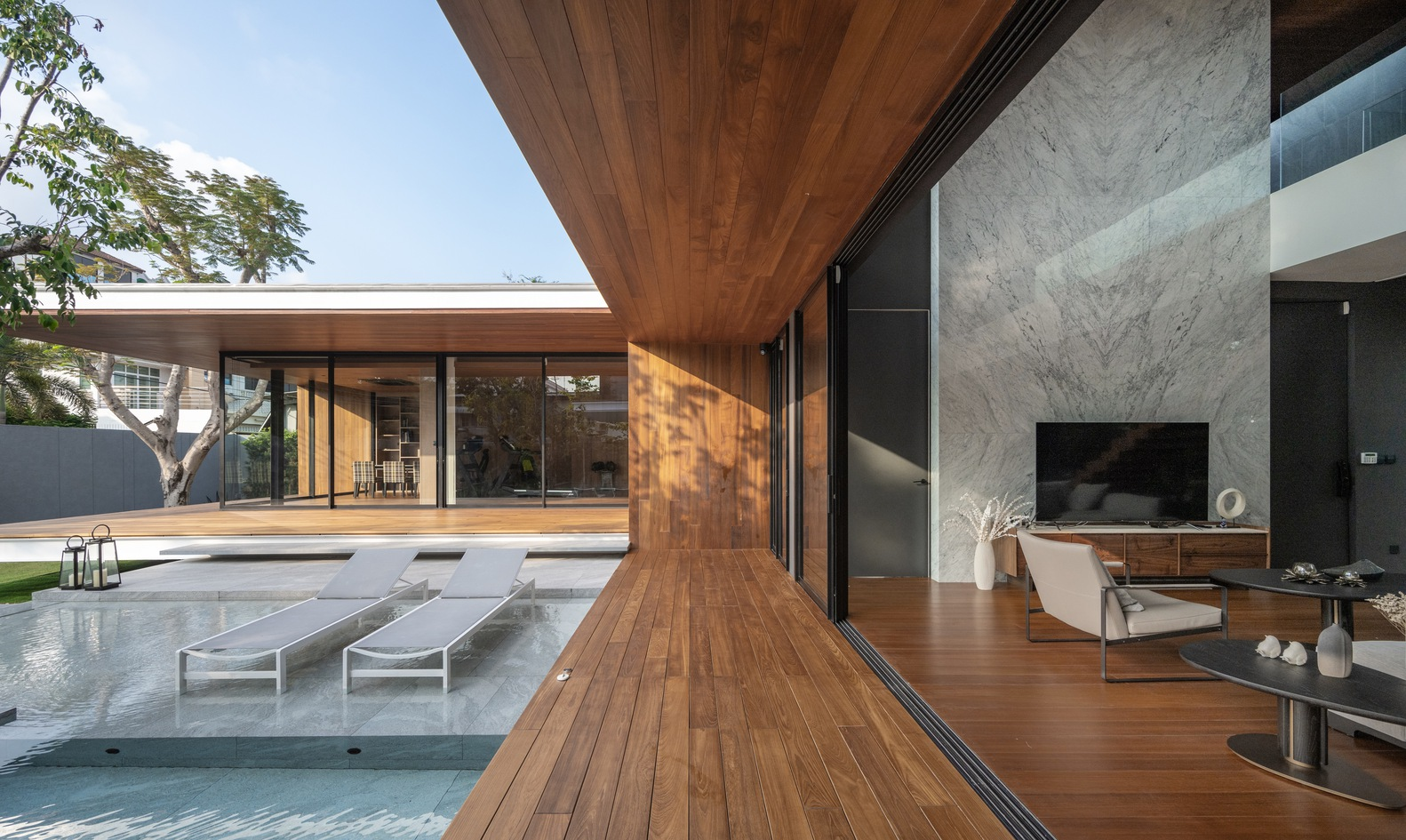 The interiors of the N26 Residence reflect the homeowner’s passion for natural materials and refined craftsmanship. Real wood is extensively used for flooring, walls, and ceilings, both inside and out, as part of the family's wood business heritage. This consistent material palette infuses the spaces with warmth and character.