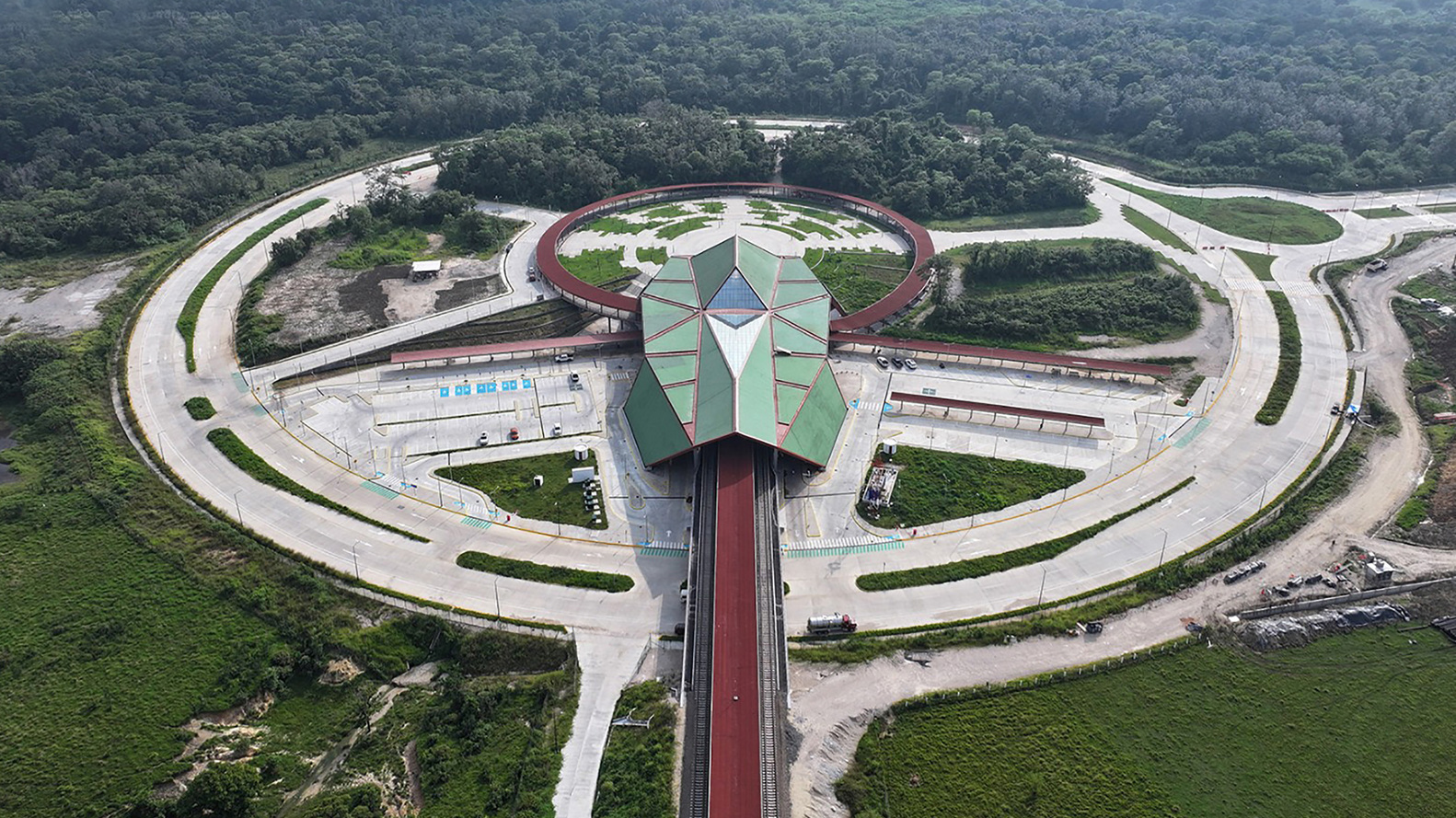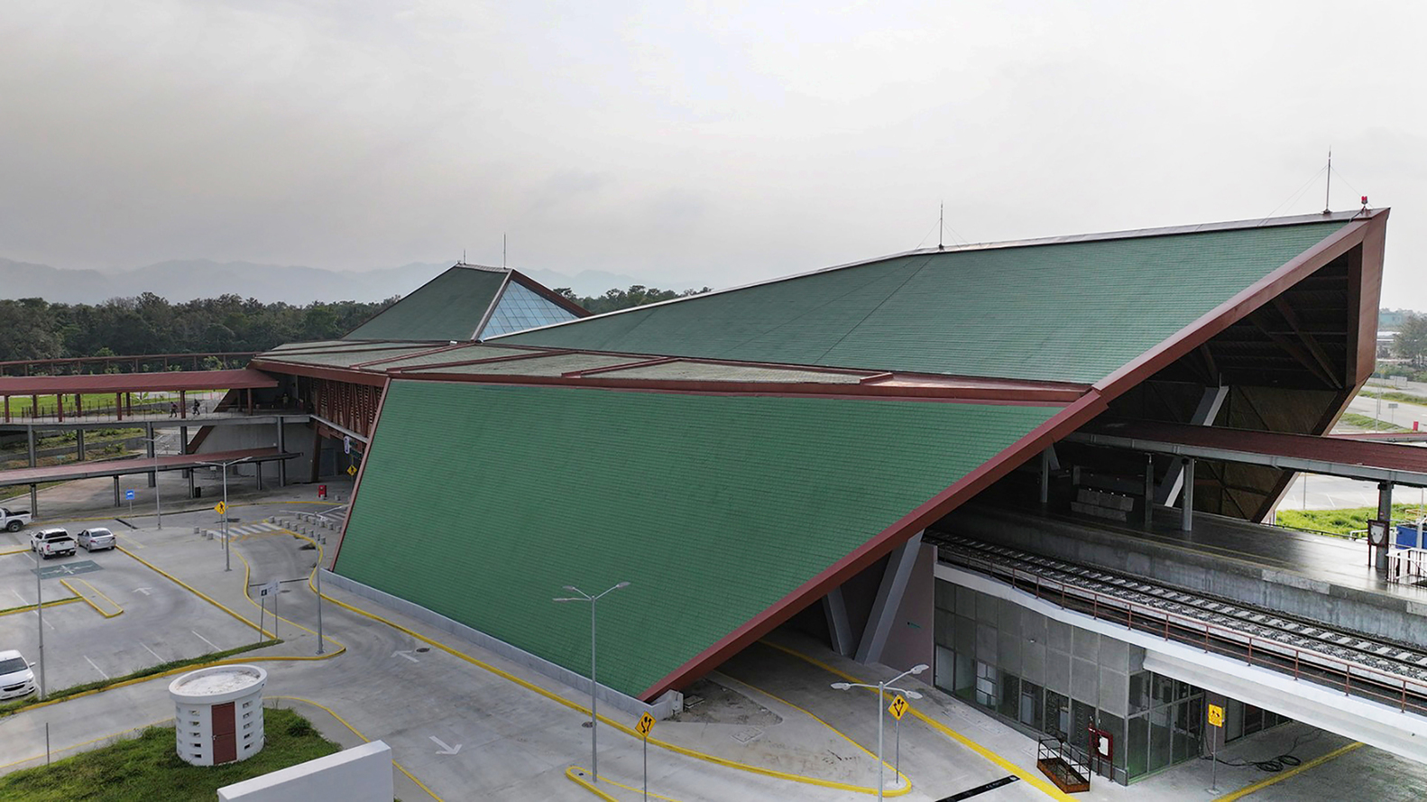 The architectural concept of Palenque Station draws heavily from both Maya heritage and vernacular construction techniques. The station’s most striking feature is its expansive roof, shaped with sloping planes and covered with green tiles. This design evokes the undulating landscape of archaeological sites hidden within the jungle, resonating with the cultural legacy of the Maya civilization.