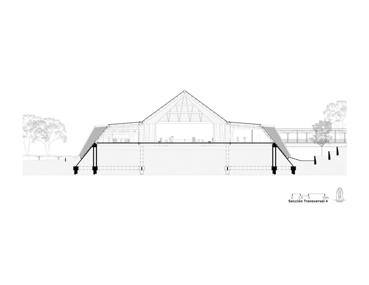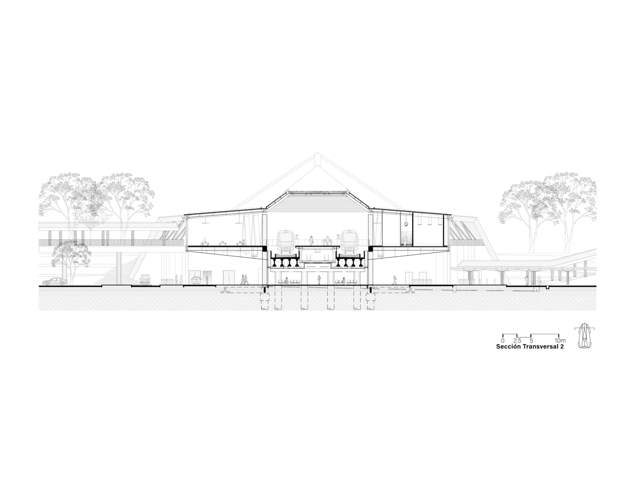 The station’s spatial design is meticulously planned to serve its multifaceted role as a transportation hub. On the lower level, landscaped areas connect the roadway to the multimodal transport platform. Beneath the platform, technical spaces house essential railway operations, ensuring efficiency without compromising the aesthetic.