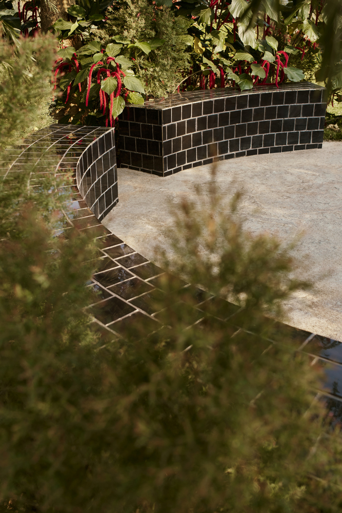 A focal point of the design is the shimmering black pool, envisioned as a monolithic jewel reflecting the architecture and surrounding trees. This pool, designed as an overground structure, plays a central role in defining the outdoor experience. The deck’s parabolic roofline not only extends shade over the living areas but also creates a striking visual element that frames the natural landscape.