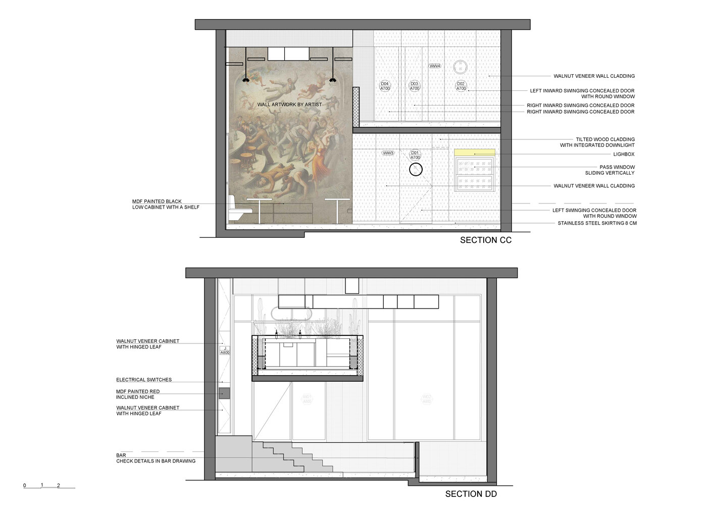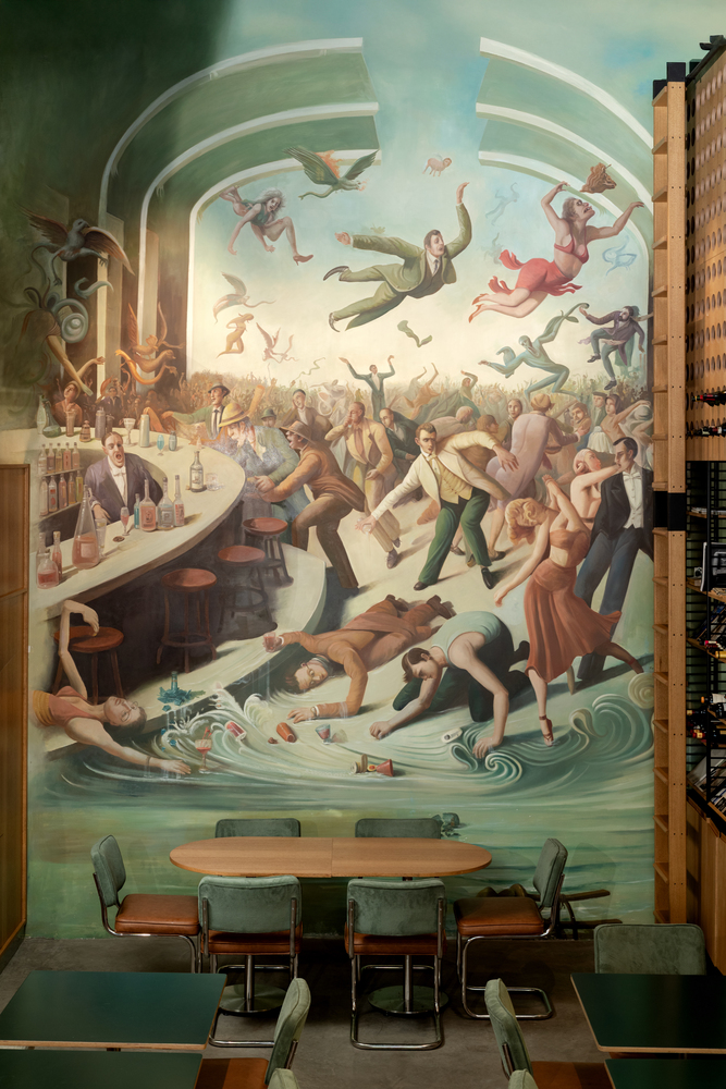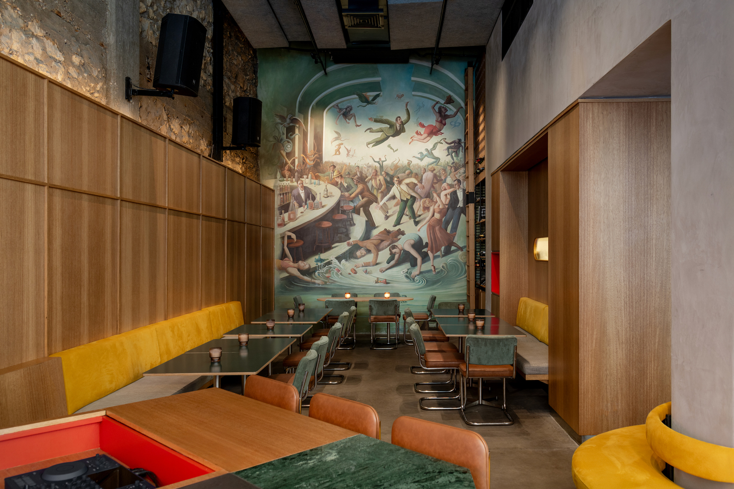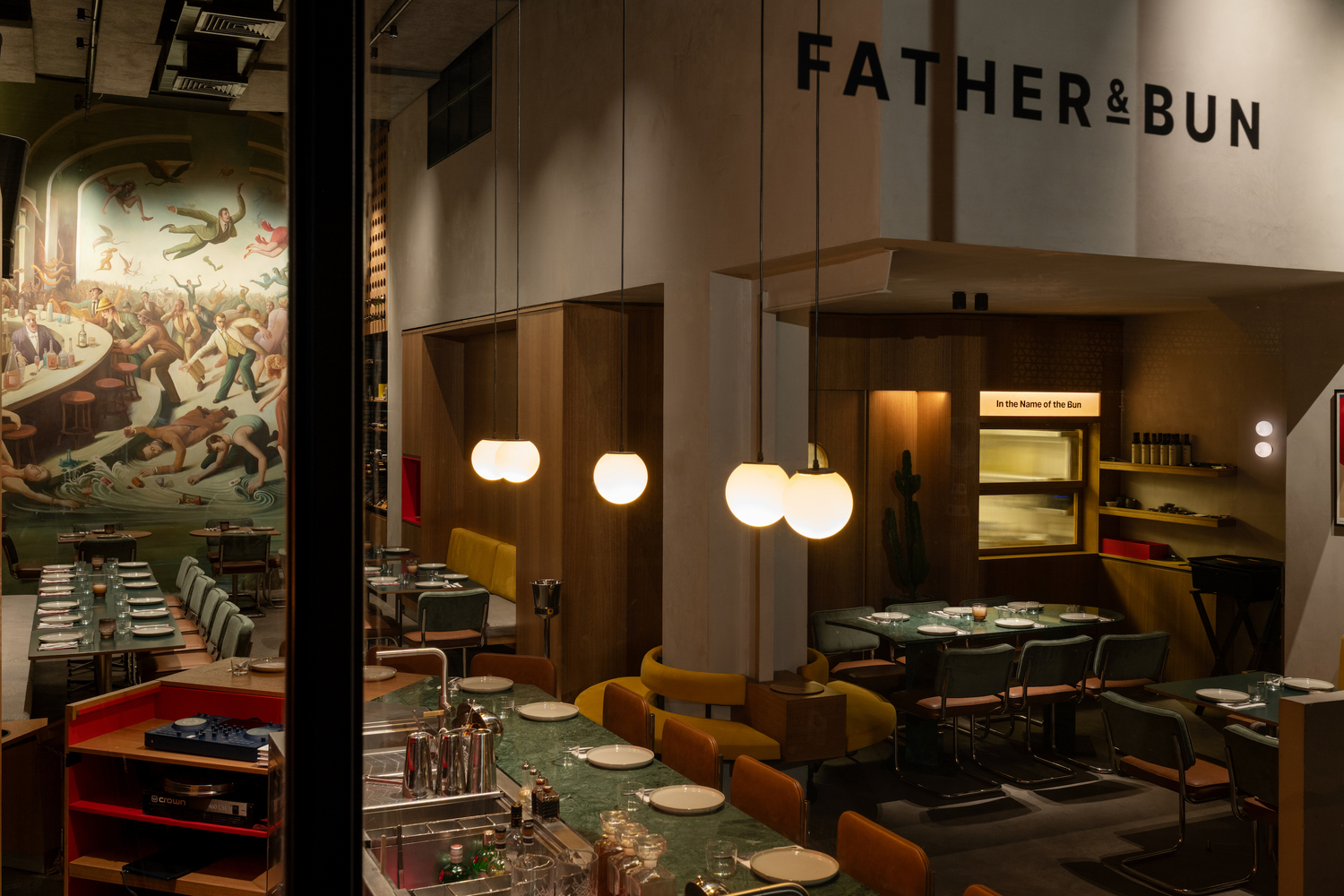 Even before entering, the visual identity of Father & Bun asserts itself with a dramatic double-height mural visible through the facade. Painted using traditional church techniques, the artwork depicts a surreal, indulgent party — a tongue-in-cheek fusion of sacred and profane, art and appetite. This mural encapsulates the project’s ethos: storytelling through architecture, art, and cultural references.