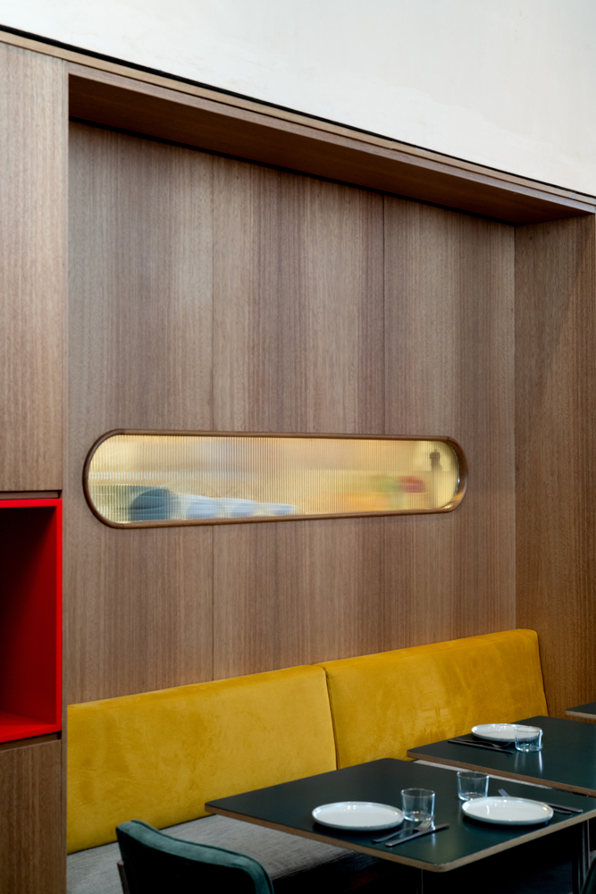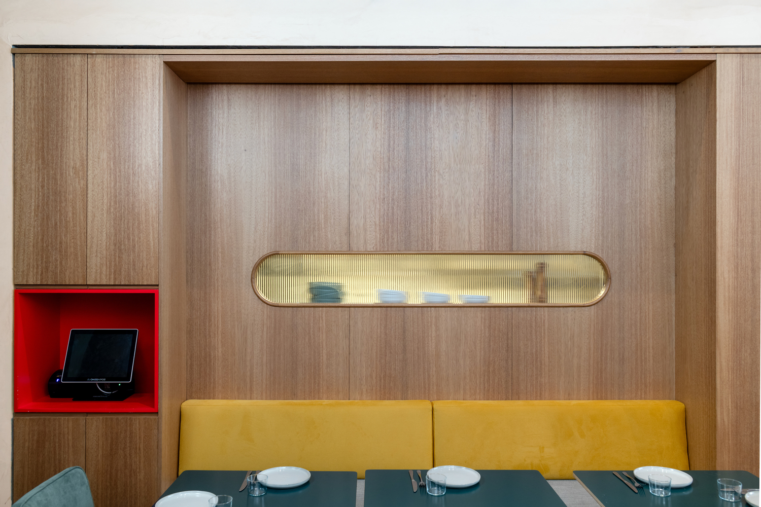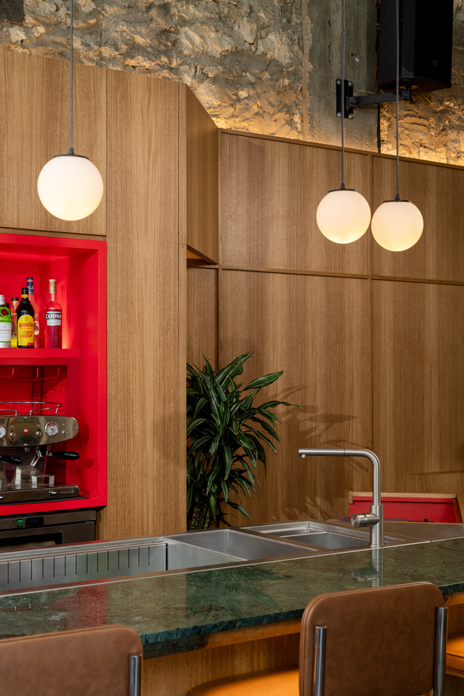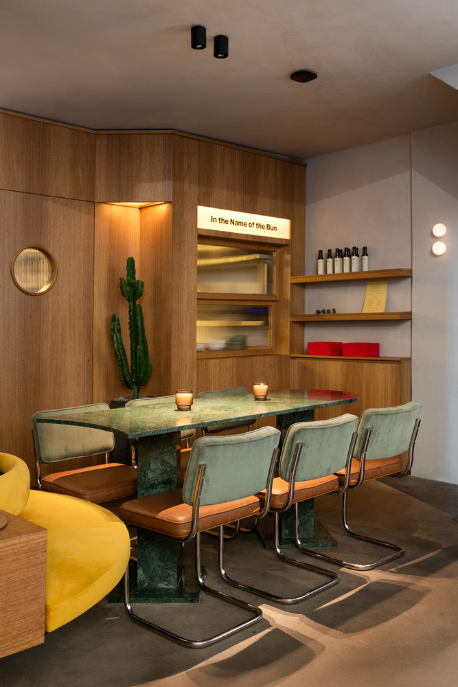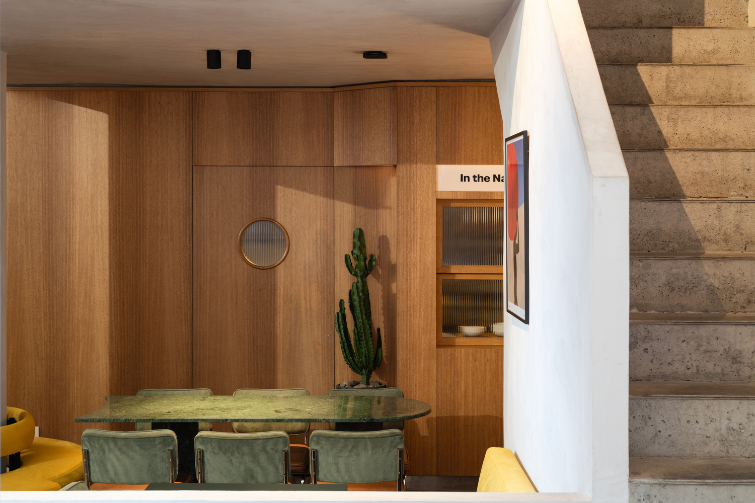 The restaurant's unique sunken positioning below the sidewalk level informed the spatial choreography. A descending staircase welcomes guests into the space, guiding them toward a sculptural bar — built in steel, clad in vertical wood, and topped with a green counter aligned to street height. This element acts as both a centerpiece and a functional threshold, blending art and utility.
