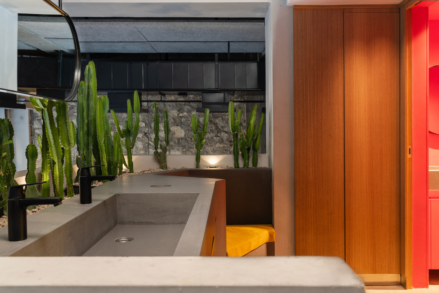 In a gesture of cultural and economic resilience, all furniture was custom-designed and locally crafted to support Lebanese artisans. Rich materials define the seating palette: velvet mustard-yellow and soft grey chairs, leather-wrapped bar stools, and deep green-topped tables with coffee-toned stainless steel bases. The chromatic warmth grounds the eclectic interiors in a cohesive visual narrative.