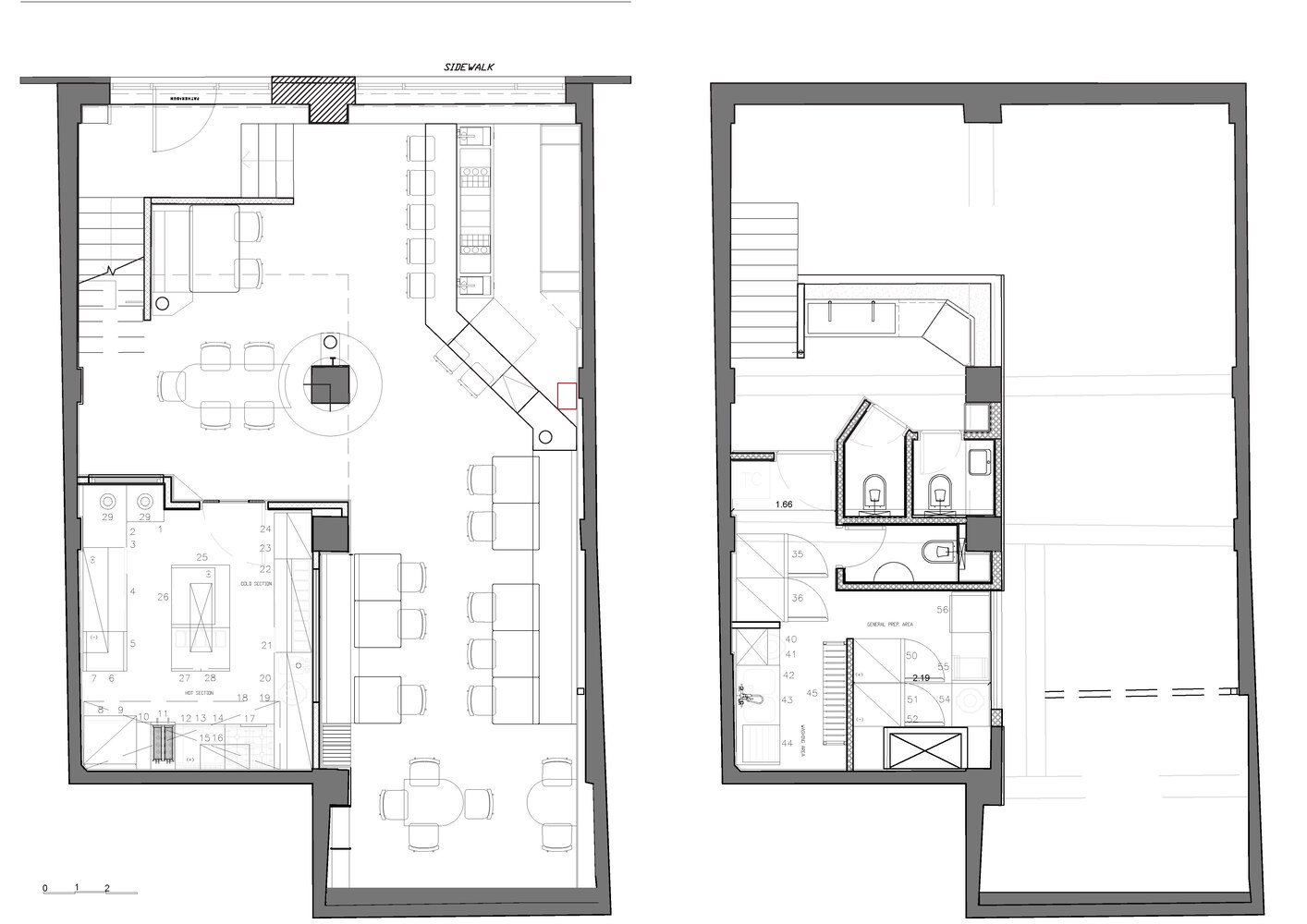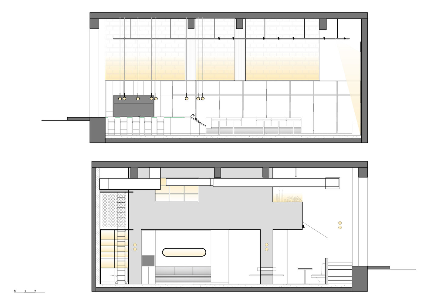 The interior unfolds into two main zones. Beneath the mezzanine, a relaxed bar area offers casual seating for cocktails and bites. Deeper inside, a more intimate dining area emerges, defined by continuous bench seating lining three walls. This layout fosters communal experiences without compromising comfort or circulation. The clever use of narrow proportions enhances a sense of exclusivity and warmth.