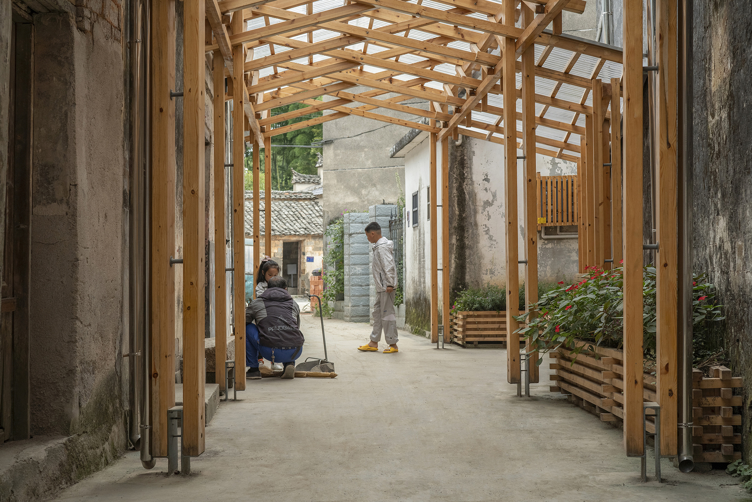 The Huizhou Corridor transforms an underutilized alley into a vibrant public space, featuring landscaped seating areas and a transparent roof that maximizes natural light. This thoughtful integration of design elements ensures the corridor serves as a comfortable and inviting space for villagers to gather, socialize, and participate in communal activities.