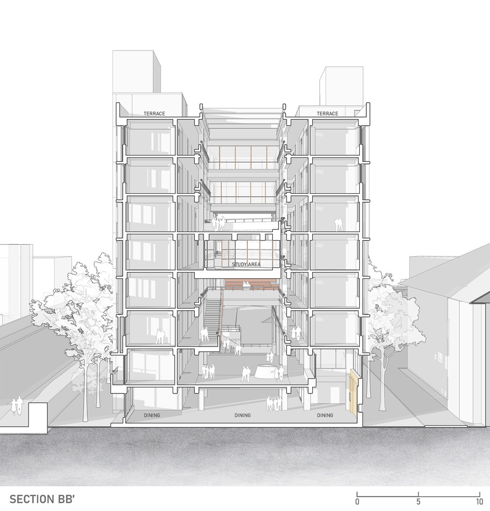 The living bridges serve as multifunctional spaces that connect different areas of the student housing. They house amenities such as study rooms, a pantry, an audio-visual room, a gym, and indoor game areas. These bridges are strategically placed to overlook an 'inner street', formed by the stacked corridors, which becomes a vibrant hub of student activity.