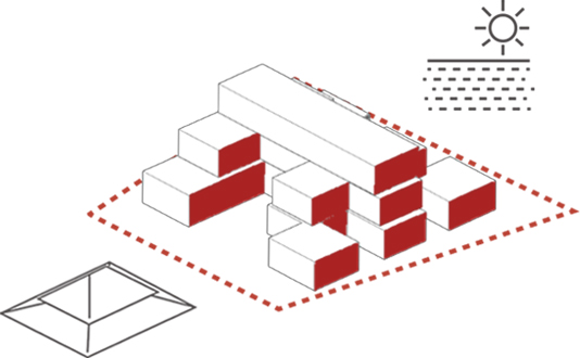 Low fenestration only permits low coming west and east sun to enter the space, while randomly placed  glass  roof  filter the rays and at the same time accentuates them.