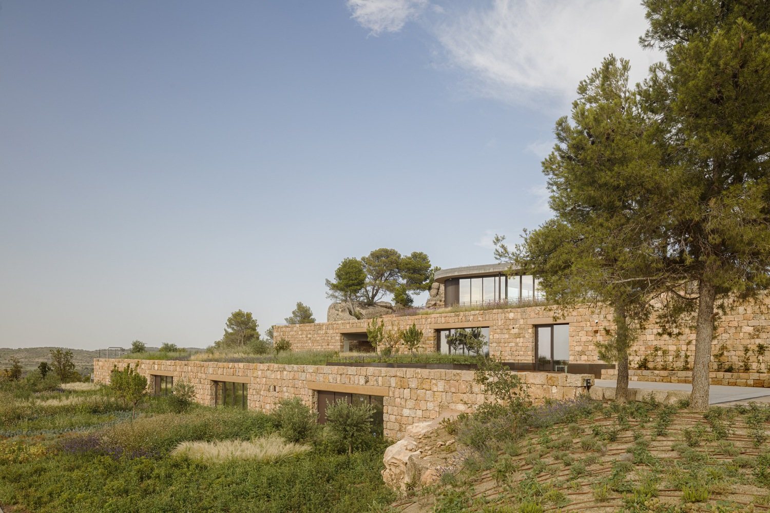The project showcases a deep respect for the land's history and its existing topography. By choosing a location with limited agricultural value and integrating the building into the pre-existing terraces, the architects minimized disturbance to the landscape. This approach, where 90% of the facility is concealed within the earth, exemplifies a commitment to preserving the natural beauty of Les Garrigues.