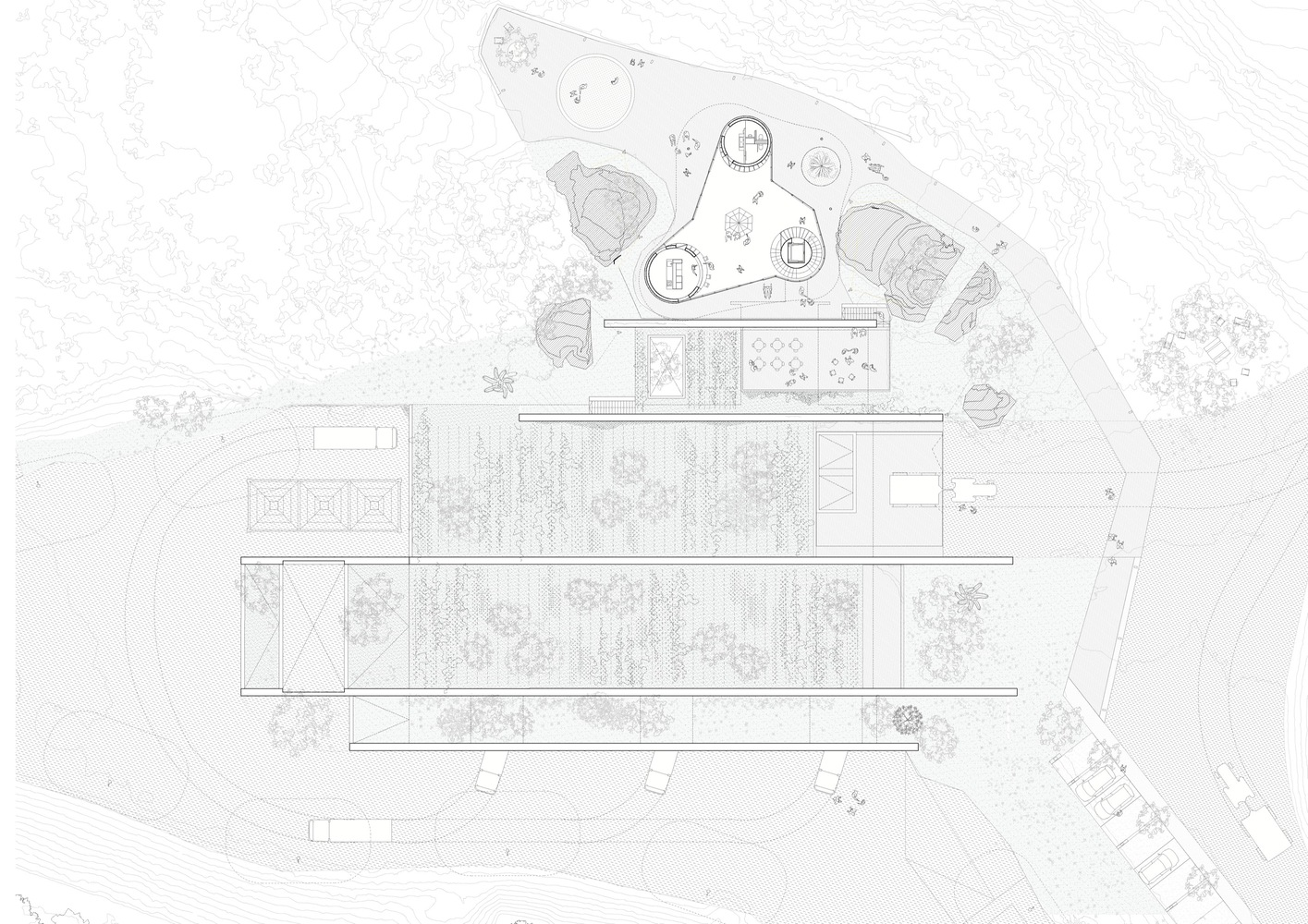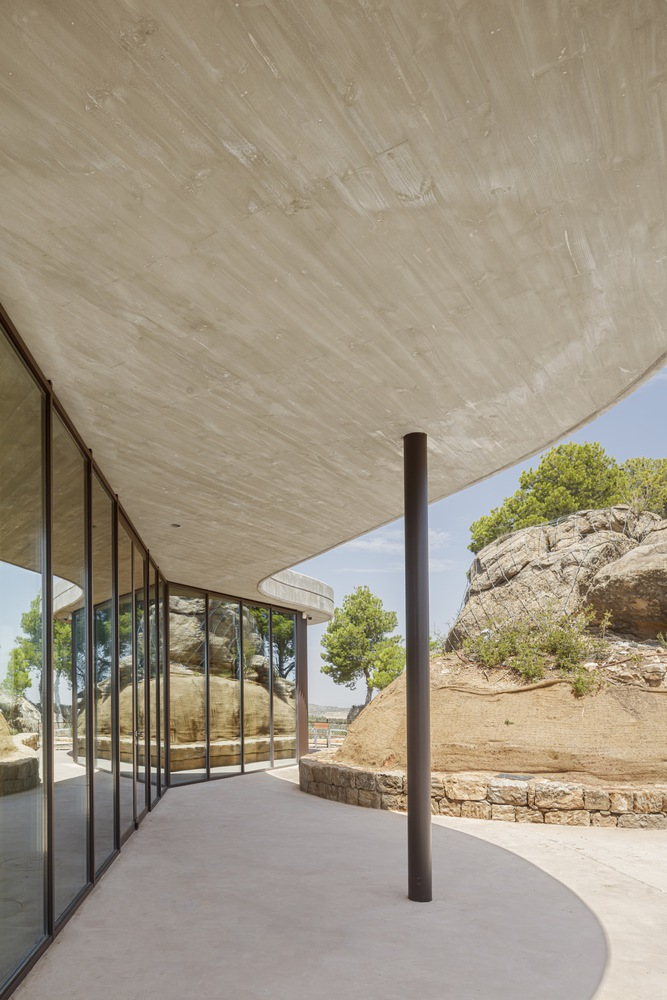 Amidst the earth-integrated main structure, the reception pavilion emerges as a beacon of modern design. This visible portion of the oil mill, designed with an organic shape and a transparent façade, offers panoramic views of the surrounding landscape. It embodies the project's philosophy of openness, inviting visitors to engage with the process of oil production and the beauty of the natural setting.