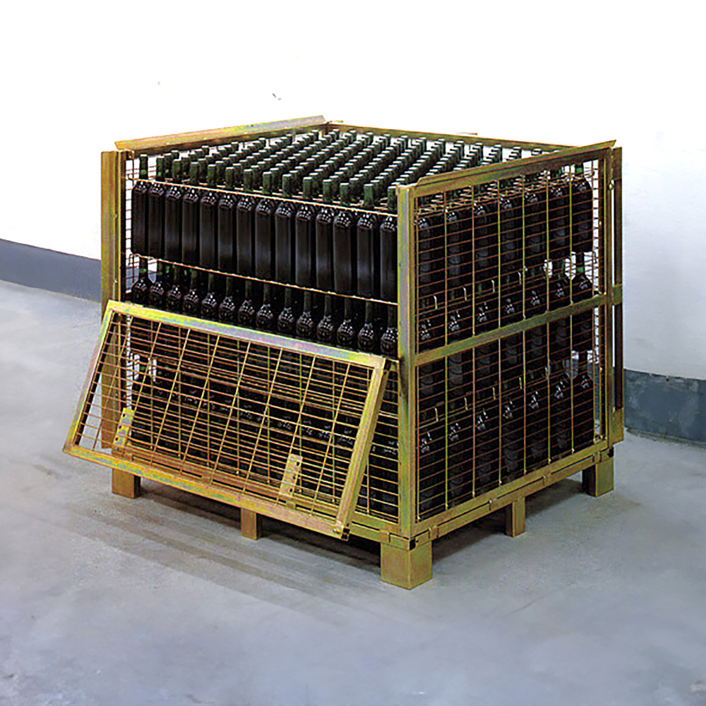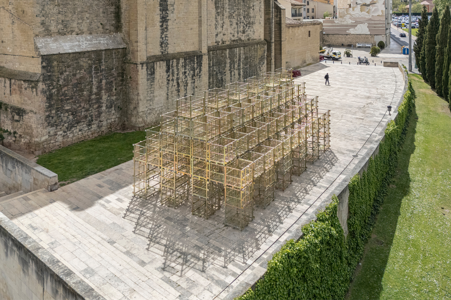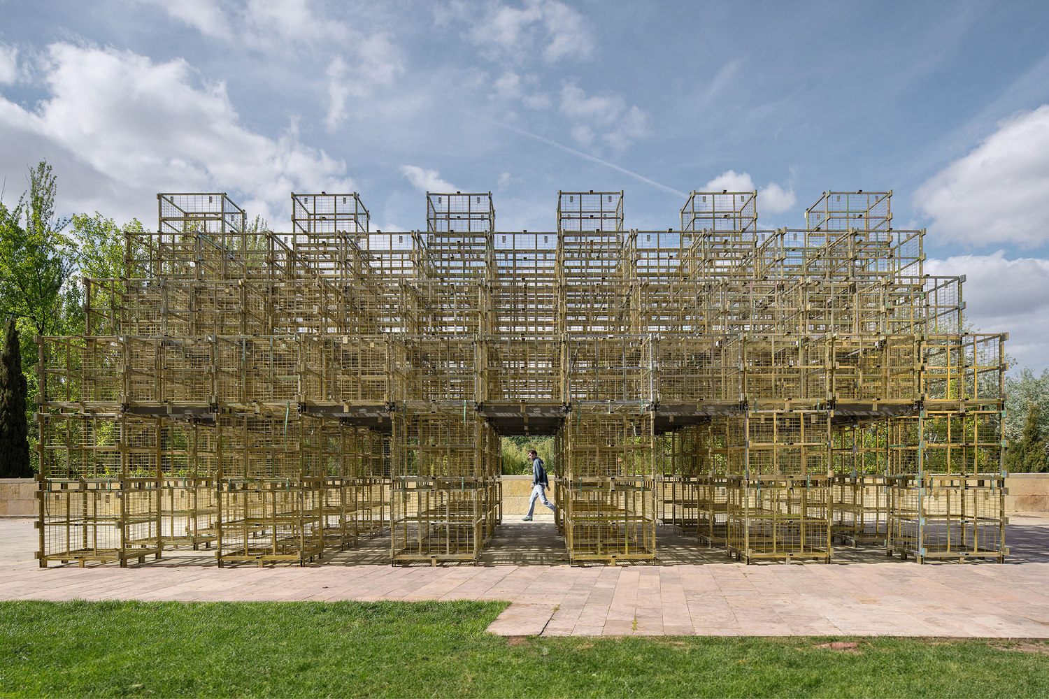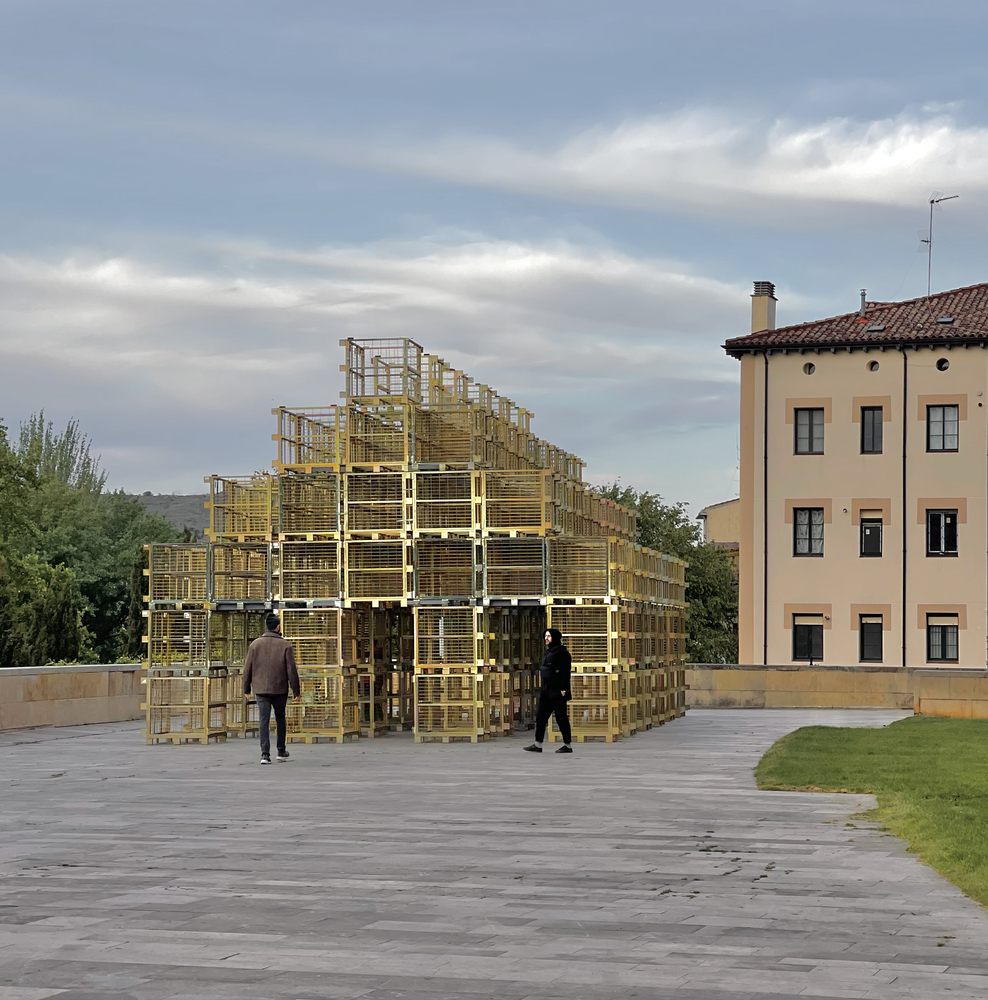 The pavilion creatively repurposes 'jaulones de vino,' which are large metal cages traditionally used to store wine bottles in the region's bodegas. These materials, which exhibit clear seasonal usage patterns, are given a new life during their off-season, aligning with the Concentrico Festival's schedule.