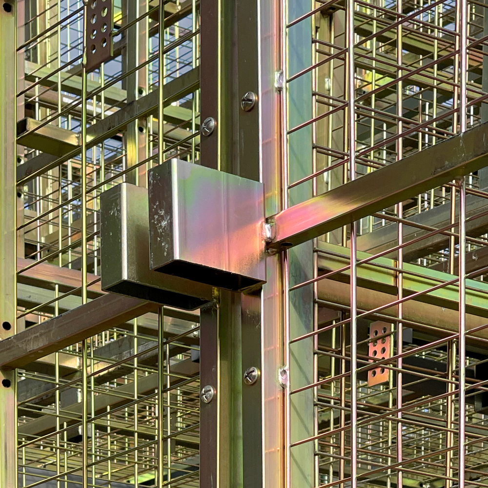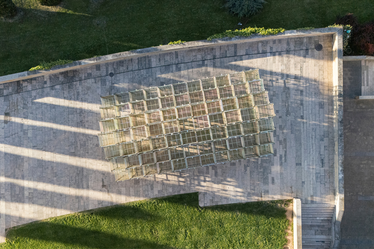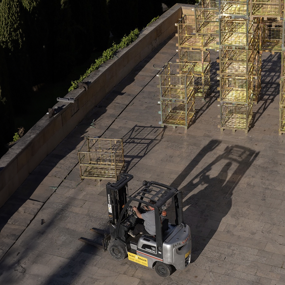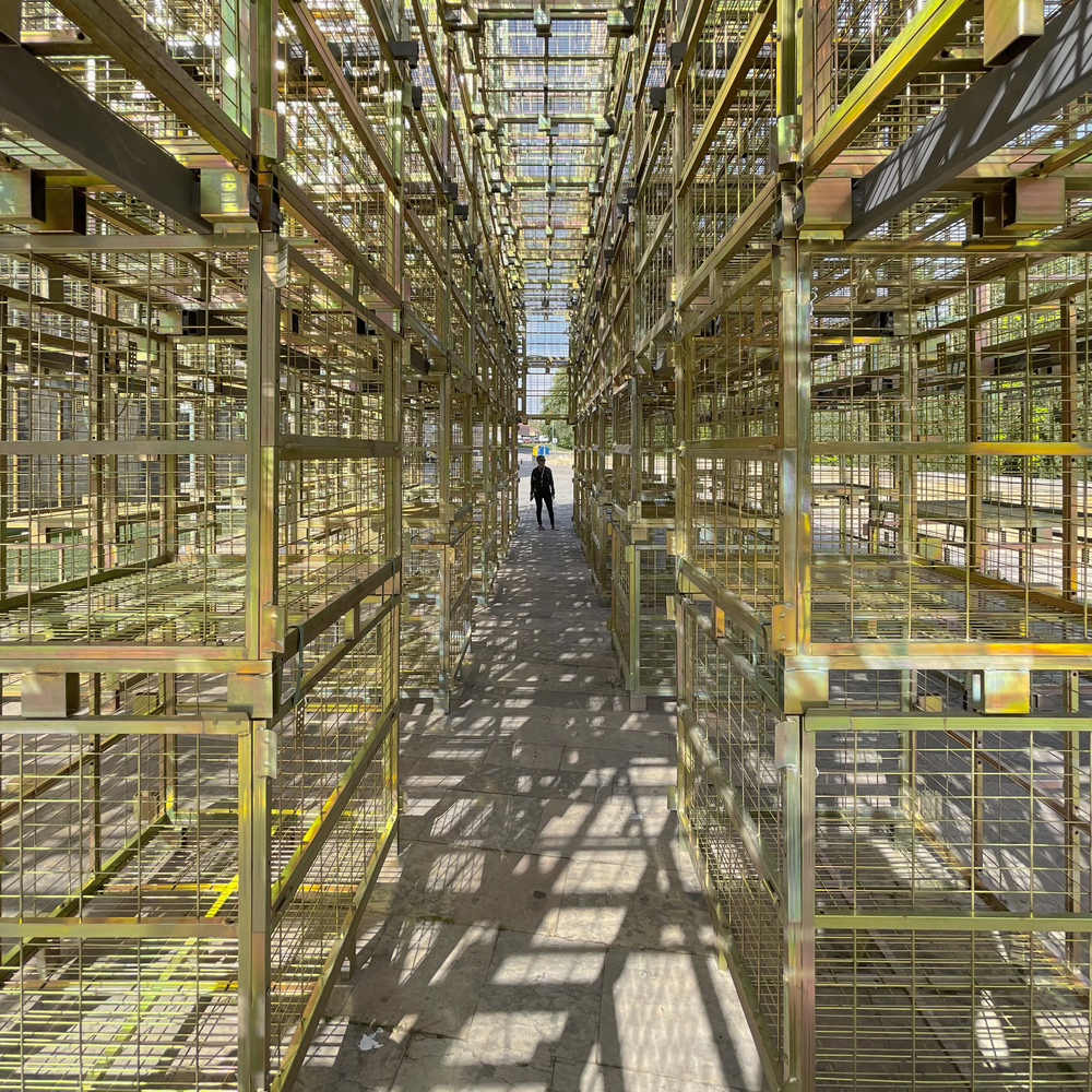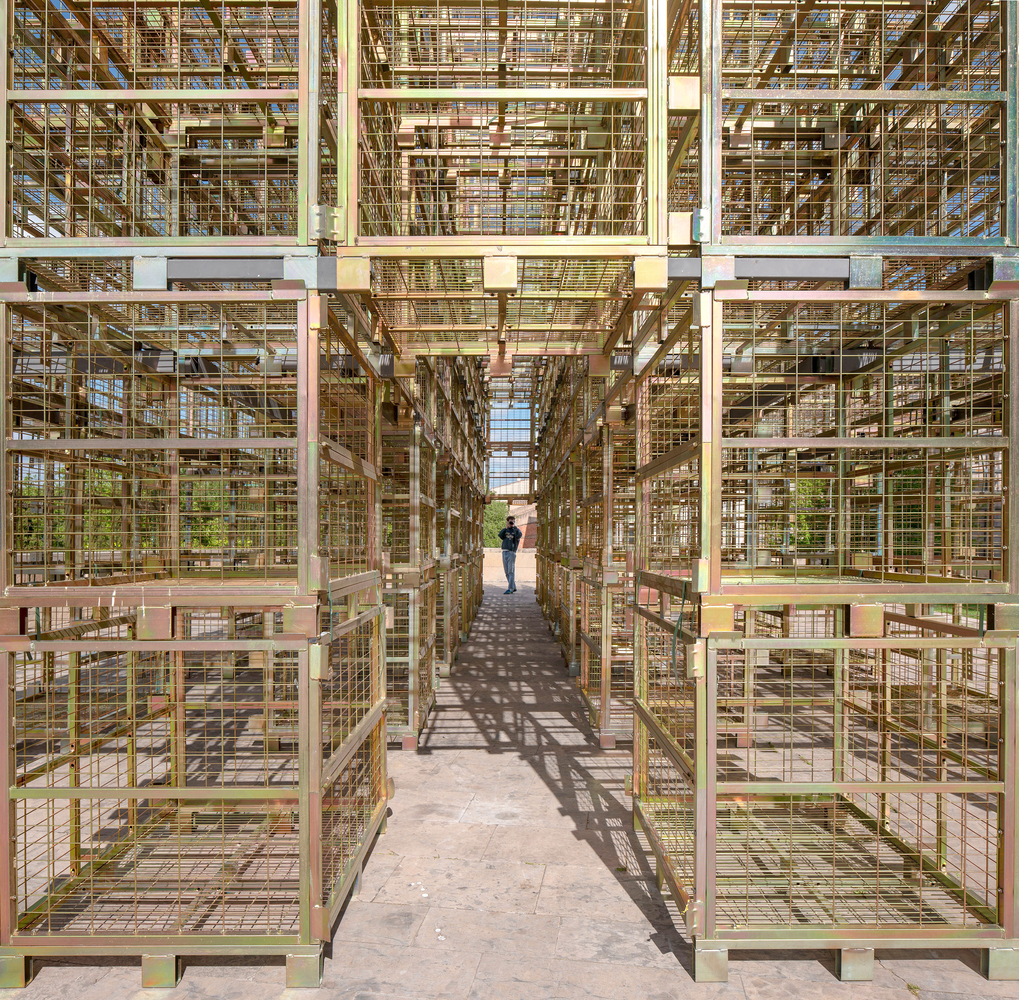 The golden meshes of the wine cages create an intricate play of light and shadows within the pavilion. This design choice transforms the space into a labyrinth of dematerialized rooms, enhancing the visitor's experience through visual and tactile interactions.