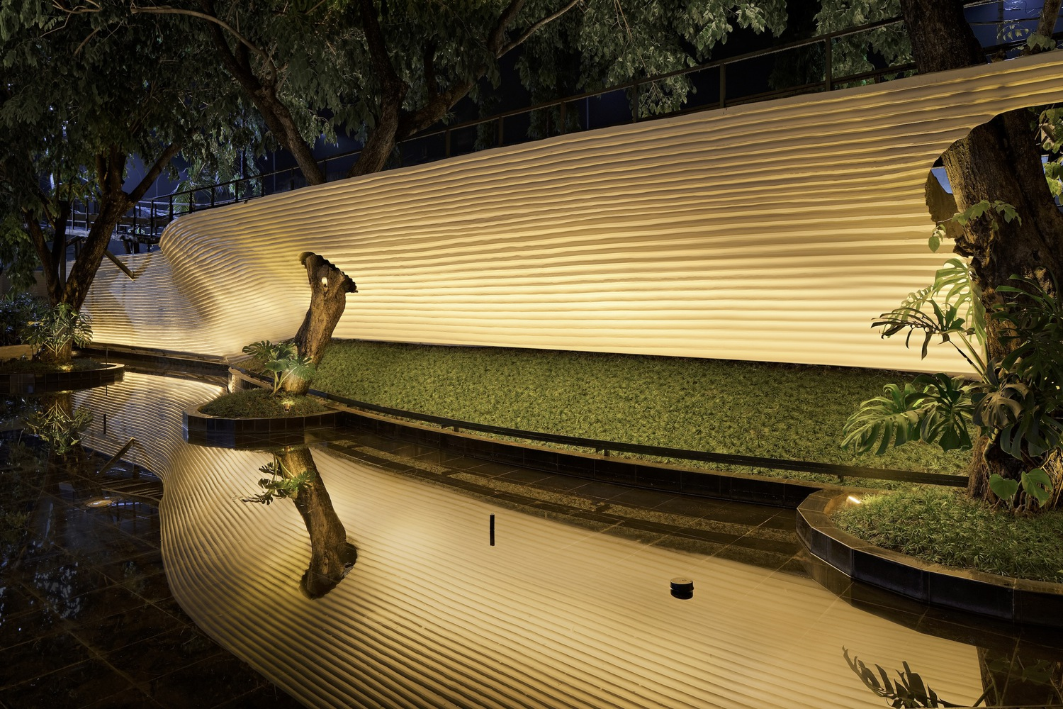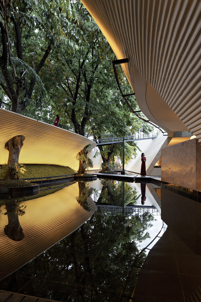 Tanatap stands as a testament to ecological and sustainable commercial garden design. An 800 sqm oasis-like reflection garden acts as the main feature, serving as a water catchment area that allows the building to operate off-grid. This commitment to sustainability extends throughout the project, from rainwater harvesting to the integration of low-energy indoor areas.