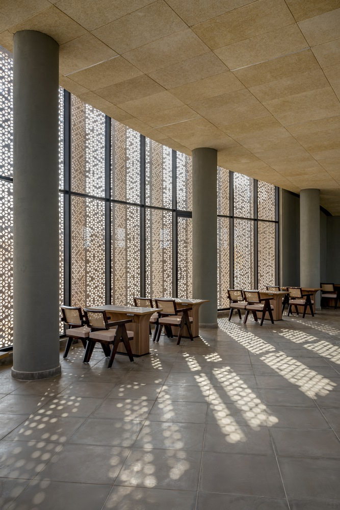 One of the Centre's hallmark sustainability features is its grass-covered earth berm on the southern side, designed to mitigate heat gain typical of the desert climate where temperatures soar between 35 to 40°C for most of the year. Additionally, the building incorporates natural sandstone screens, a nod to Rajasthan's traditional architecture. These screens are not only aesthetically pleasing but also functional, reducing heat gain and creating dynamic shadow patterns throughout the day.