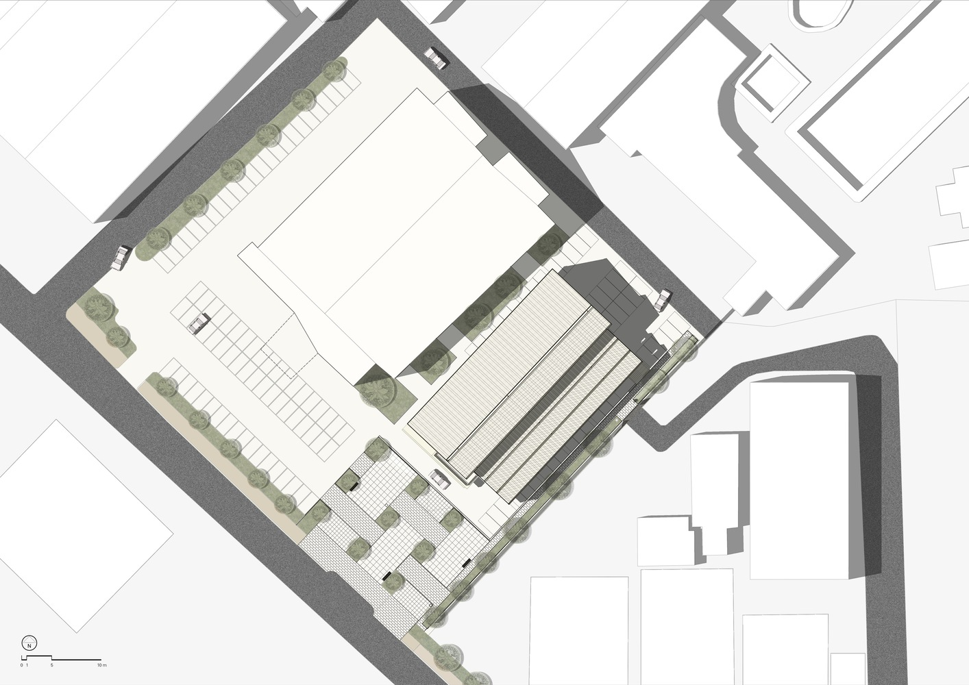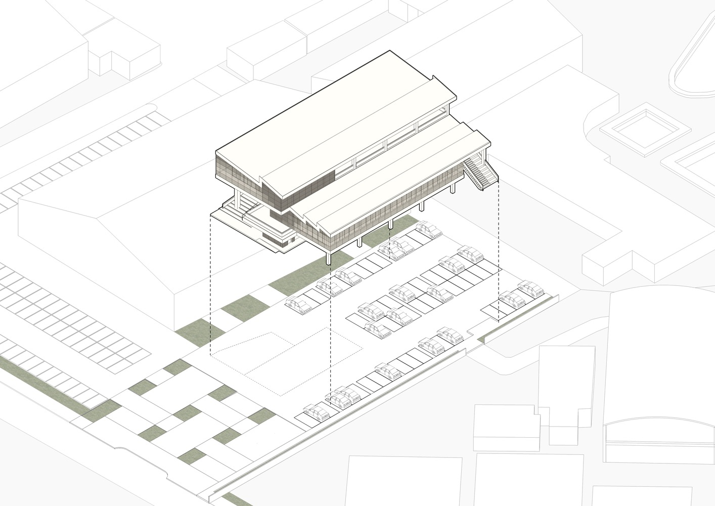 Nestled within the Dadaha sports complex, the center ingeniously preserves the existing parking lot while elevating key spaces. The design incorporates a grand seating staircase, creating a covered, semi-outdoor haven for diverse activities and community engagement overlooking a vibrant public plaza.