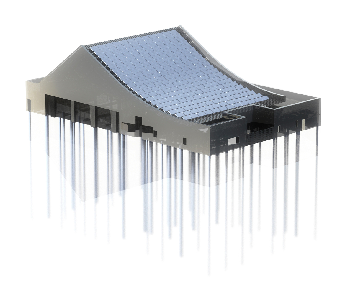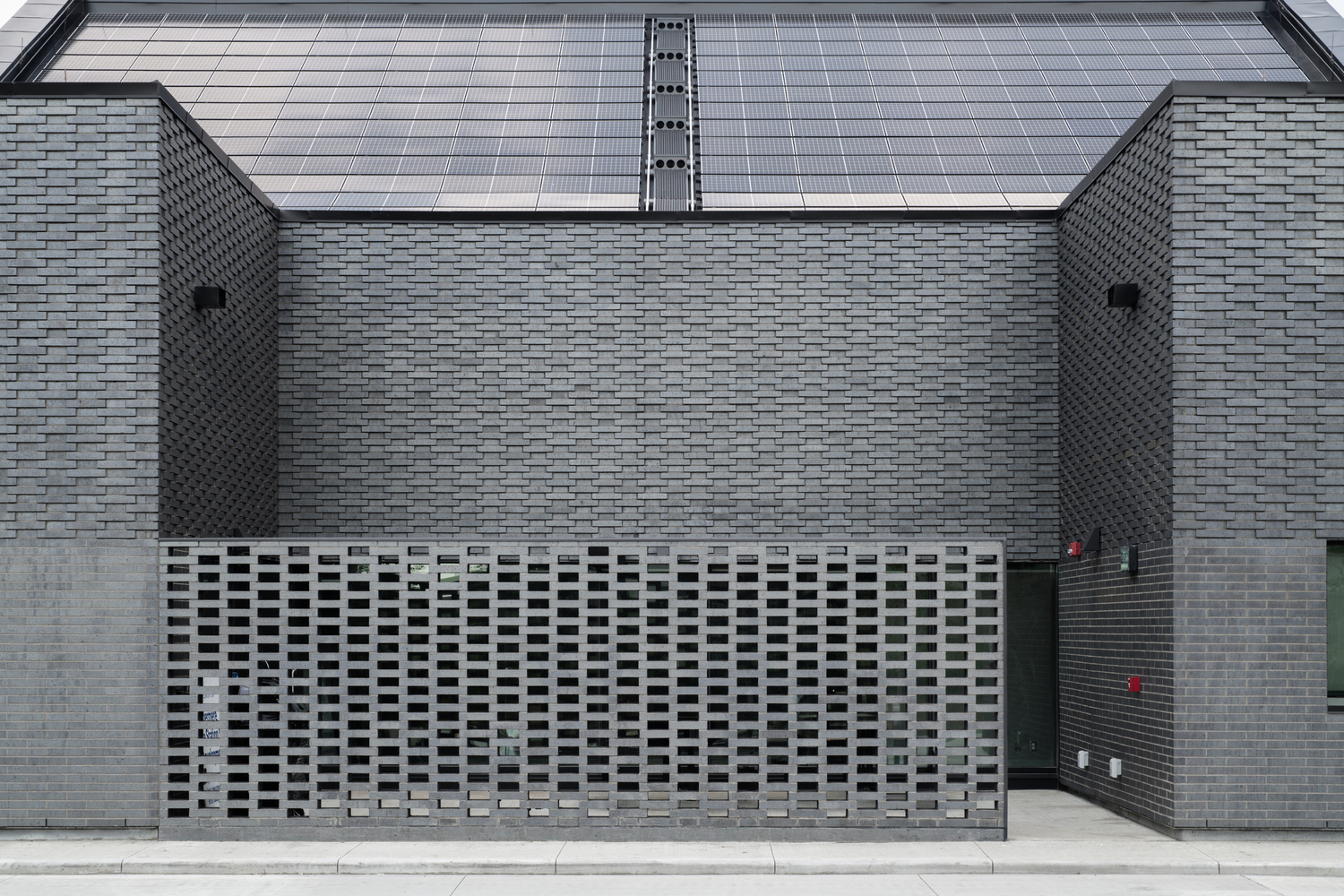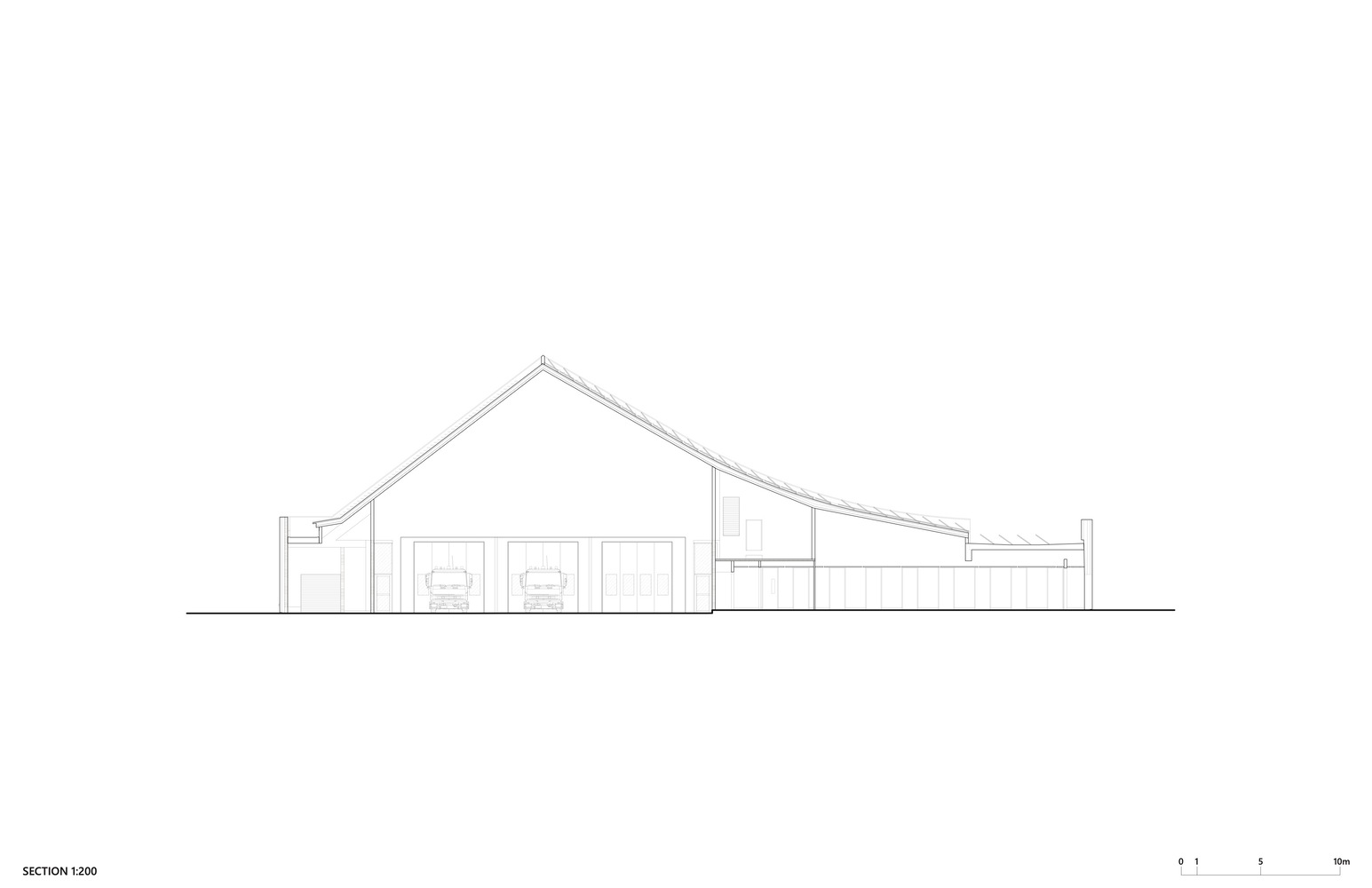 The fire station's gently curving, south-facing roof is equipped with an extensive array of photovoltaic panels, underscoring its commitment to sustainability. These panels generate enough renewable energy to meet the building's total energy needs.