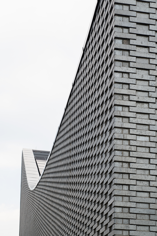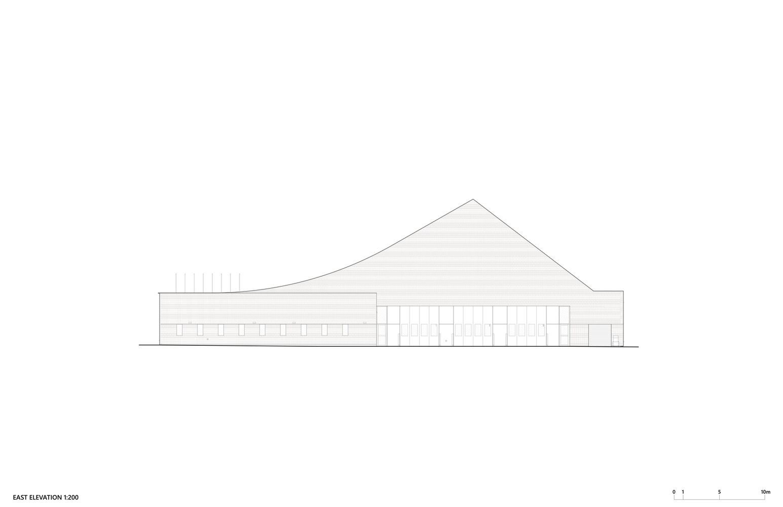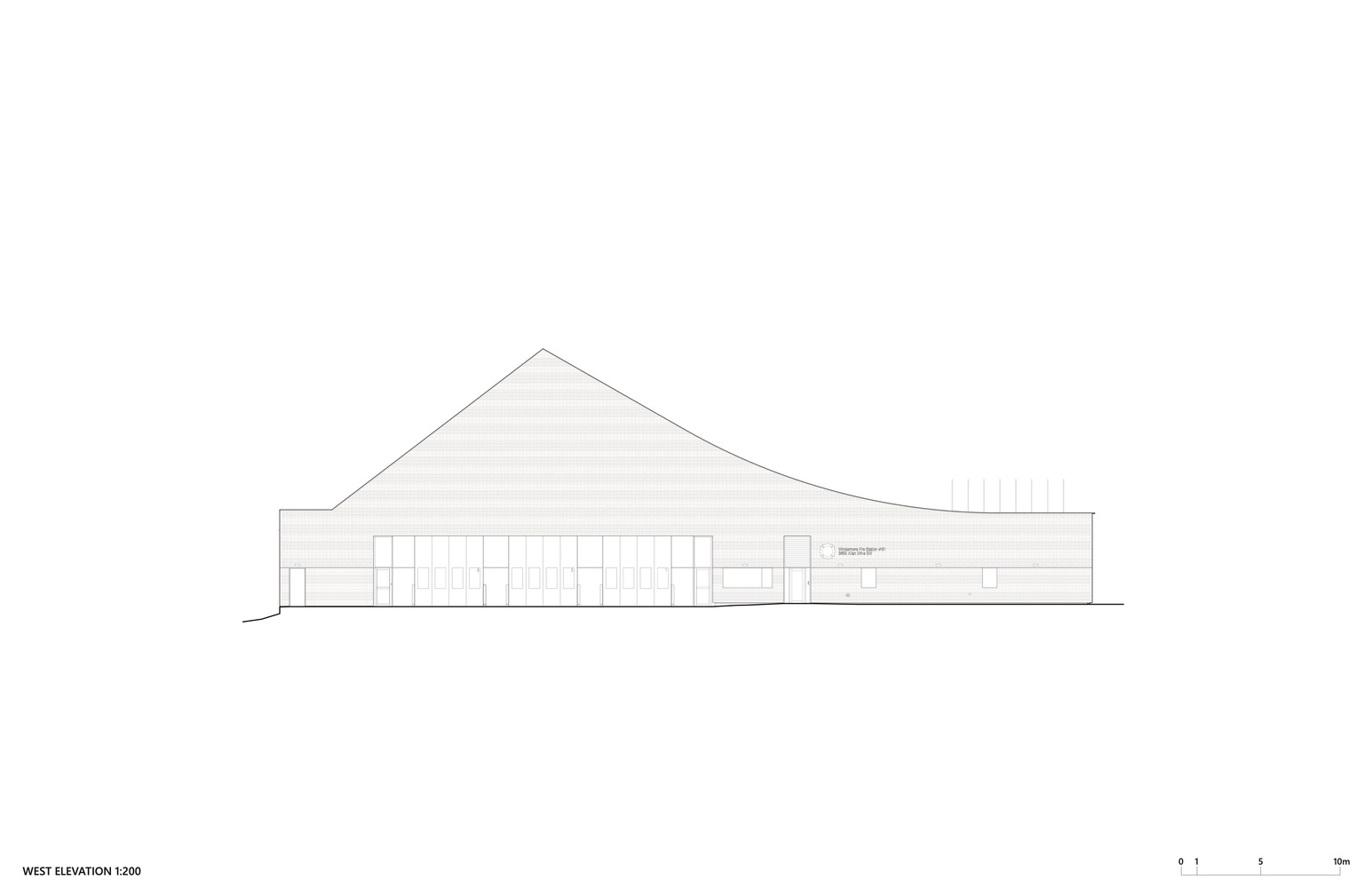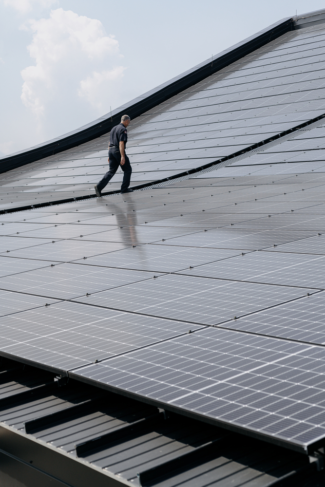 The fire station's gently curving, south-facing roof is equipped with an extensive array of photovoltaic panels, underscoring its commitment to sustainability. These panels generate enough renewable energy to meet the building's total energy needs.
