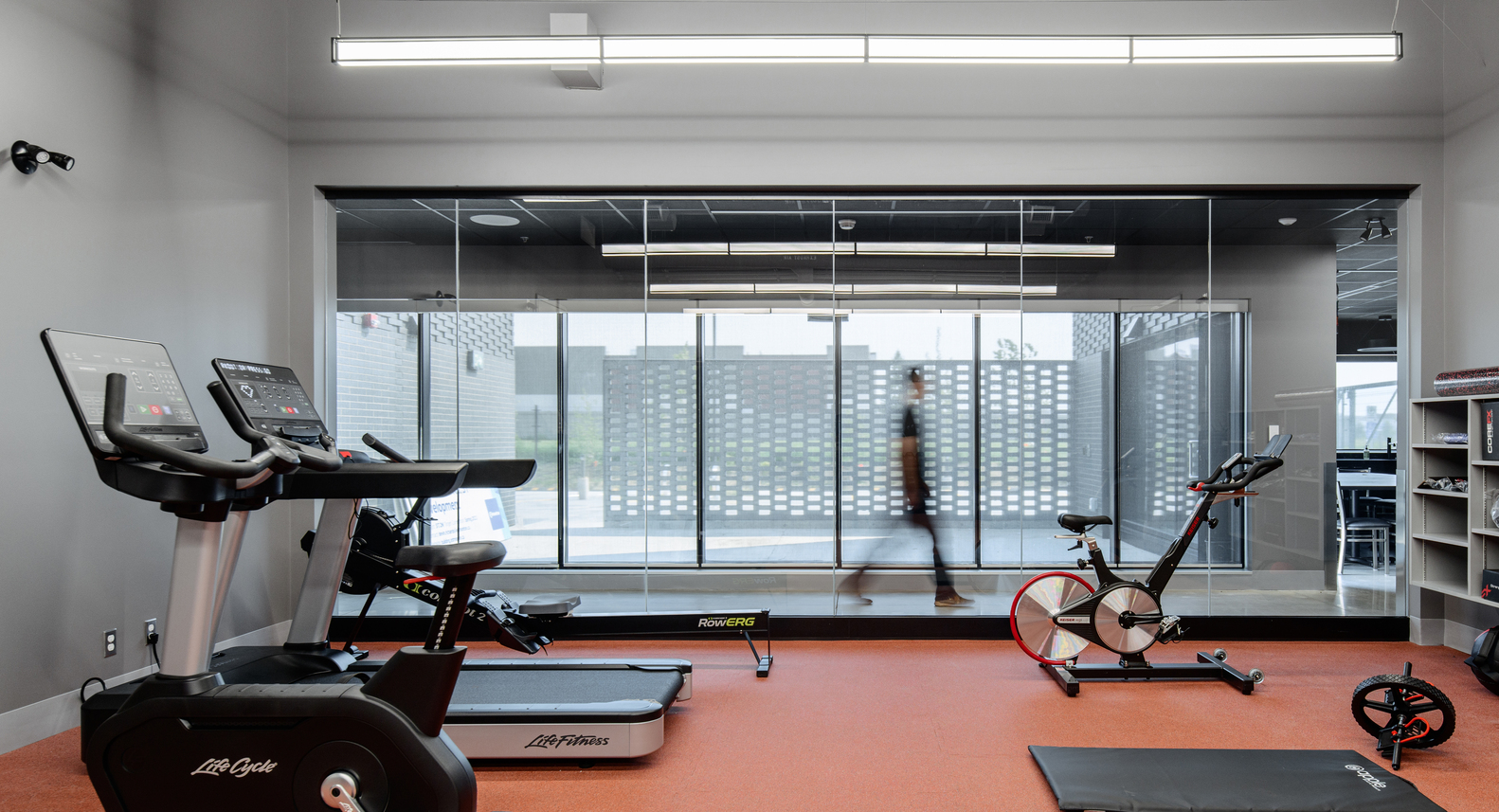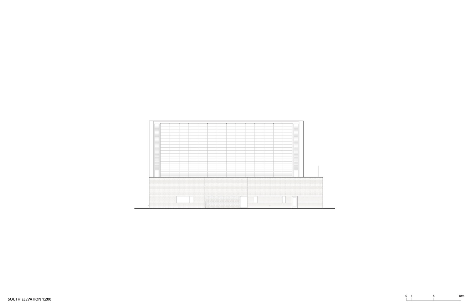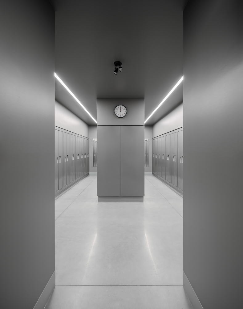 The unified mass of the fire station houses two main programmatic elements: the apparatus bay for trucks and equipment, and domestic and sleeping spaces for firefighters. The domestic area features a corridor circuit design, with change rooms and a fitness center in the middle, and sleeping areas, a kitchen, lounge, and offices around the perimeter.