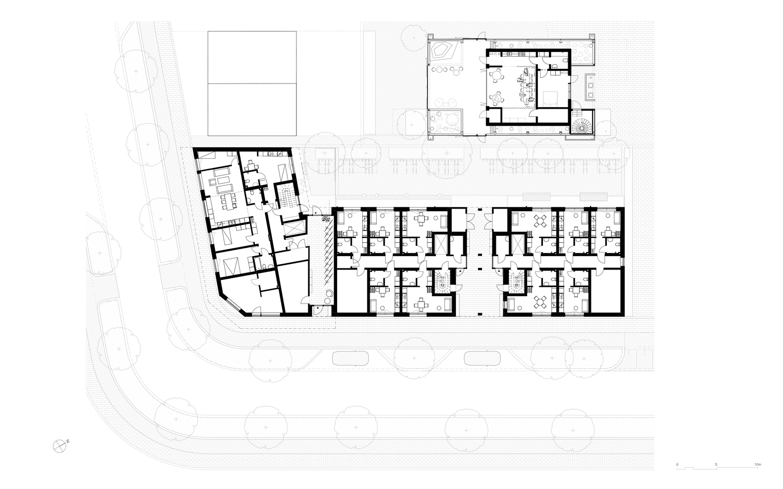 The housing complex features a mix of student and senior apartments, encouraging a vibrant, intergenerational community. Communal spaces such as the Felleshuset provide areas for interaction and social activities, strengthening community bonds.