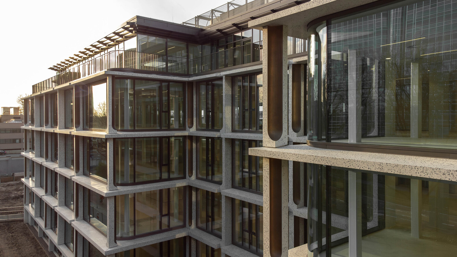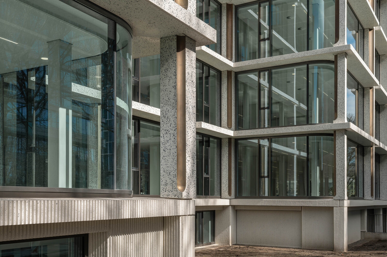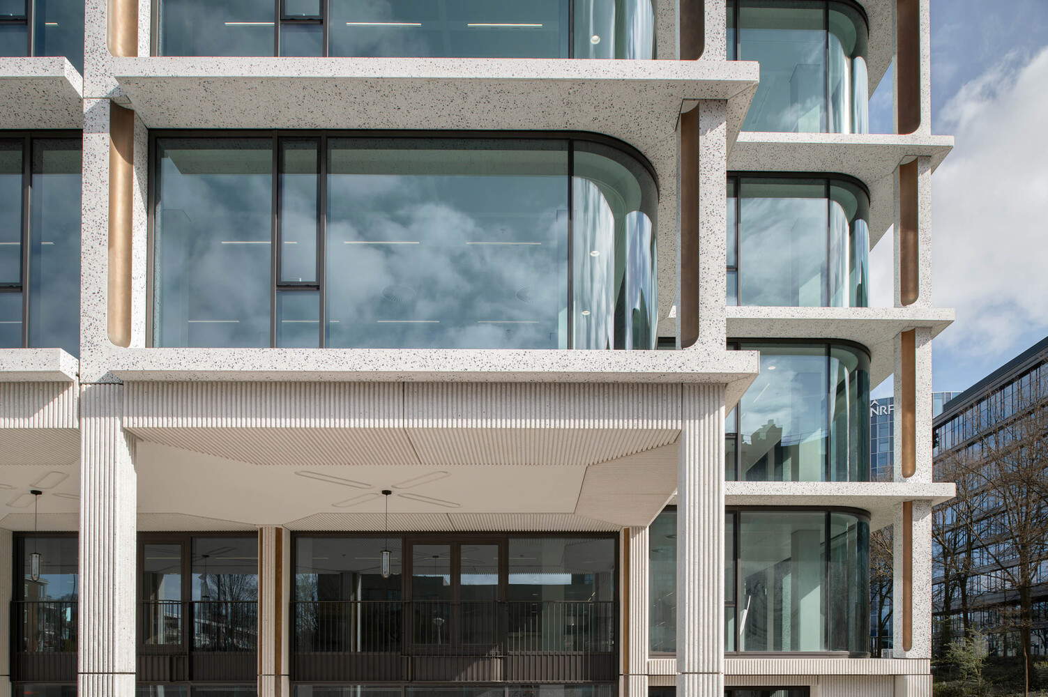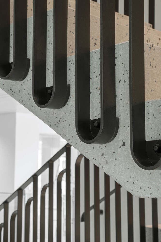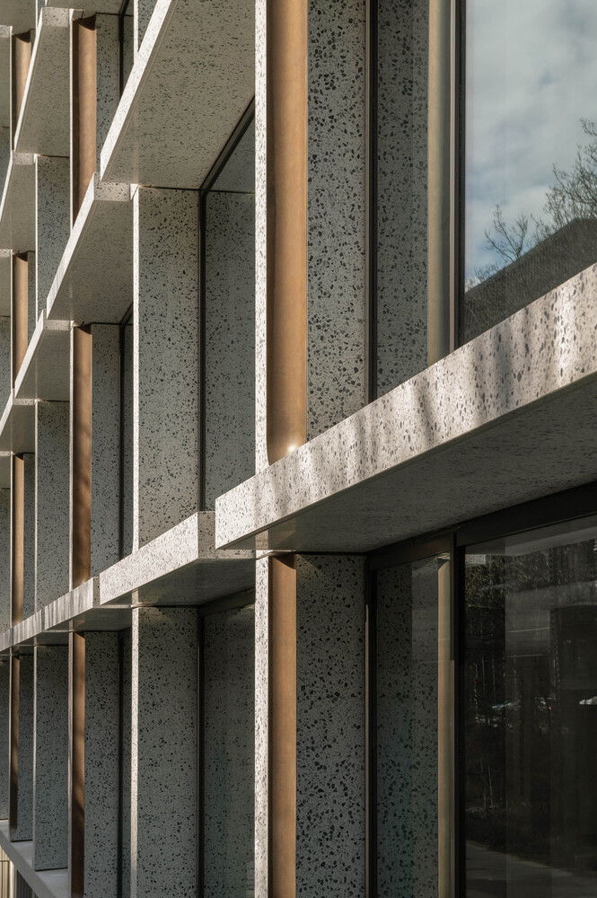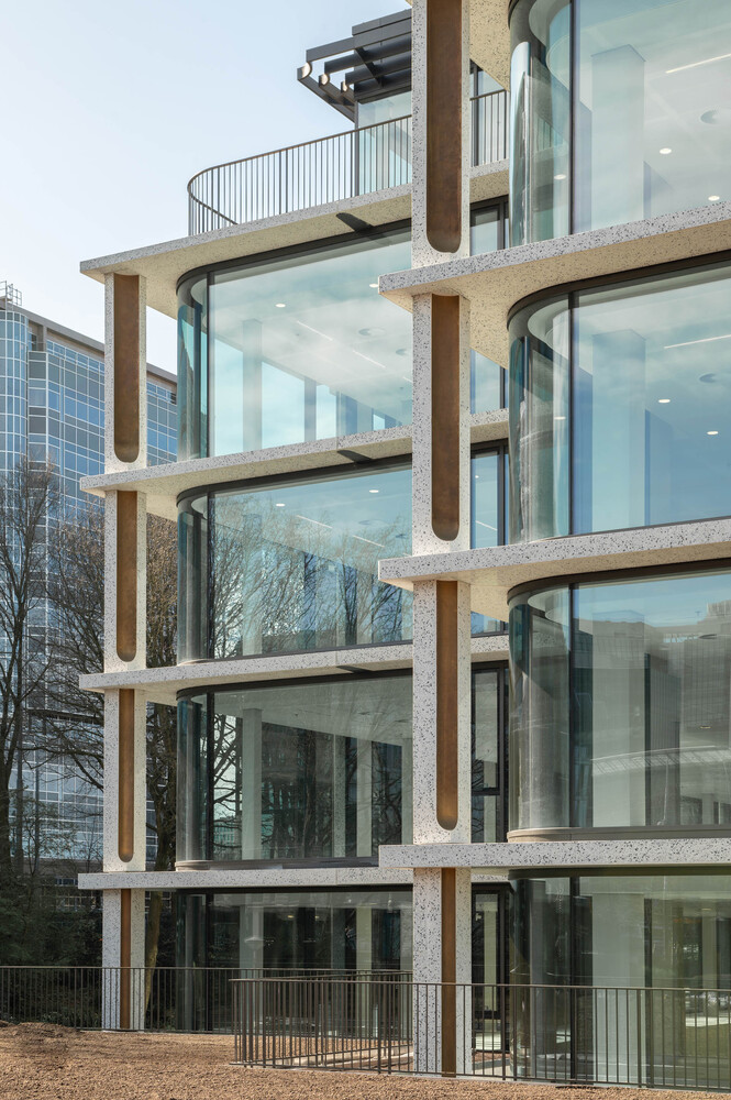 One of the project's standout features is the transformation of its facade. Moving away from the original building's brutalist character, the new facade is inviting, transparent, and refined. Large windows, bronze ornaments, and polished concrete are used to create a facade that is both lively and elegant. This redesign is not just an aesthetic upgrade but also enhances the building's environmental performance, allowing for greater natural light and reducing energy consumption.
