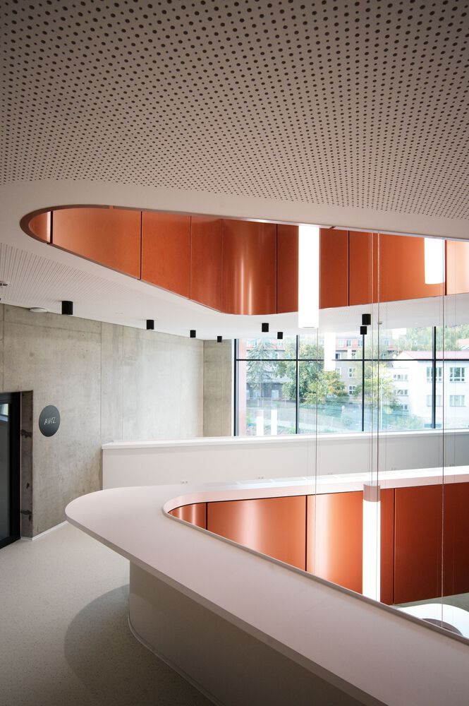 The "Center of Gravity" forum acts as the hub of the complex, connecting the CEEC and the AWZ. This central area facilitates interdisciplinary exchange and symbolizes the infinite loop of learning and discovery inherent in research environments. The building’s facade integrates slanted window reveals that not only add an aesthetic quality but also enhance the natural lighting and ventilation, crucial for sustainable building practices.
