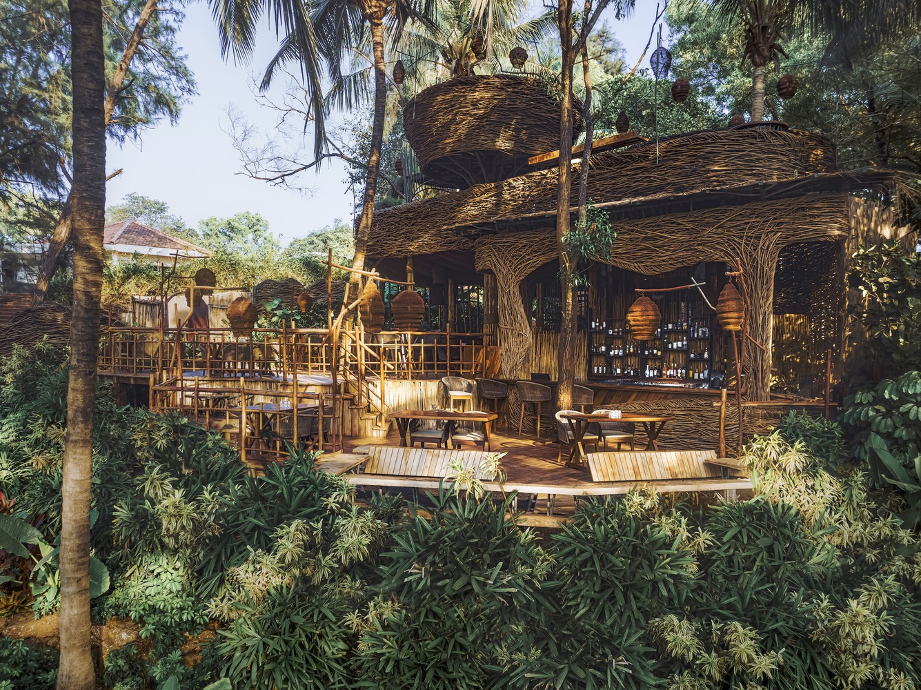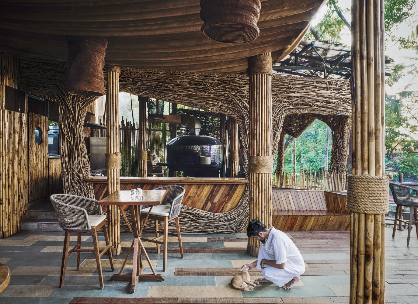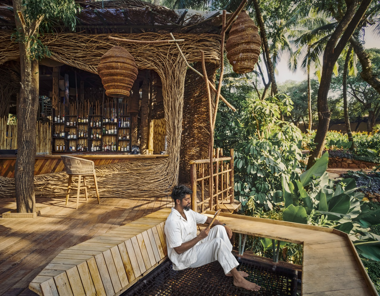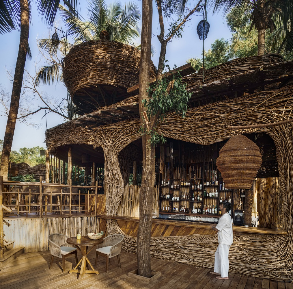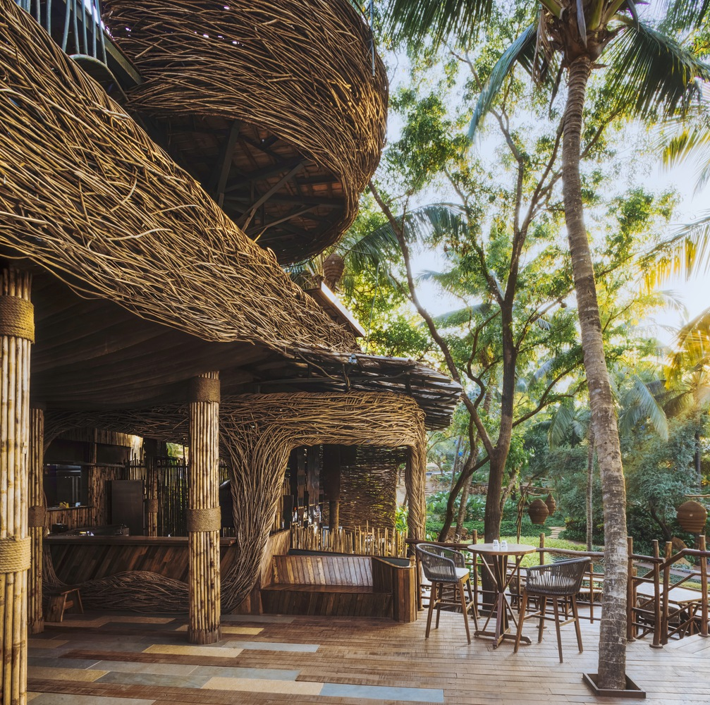 Exploring Como Agua Restaurant's sustainable design in Vagator, India, utilizing invasive species and bamboo for eco-friendly architecture.