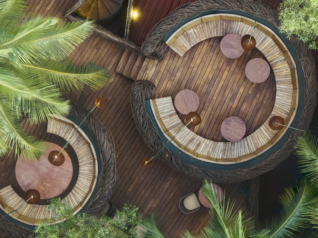 The spatial arrangement and material palette of Como Agua create a dining ambiance that is both whimsical and intimate. The top deck offers panoramic views of the surrounding landscape, while the ground floor wraps diners in a cocoon of woven Lantenna, creating a unique, nest-like dining space. This thoughtful design ensures that every meal is an experience that connects guests with nature and the ethos of sustainable living.