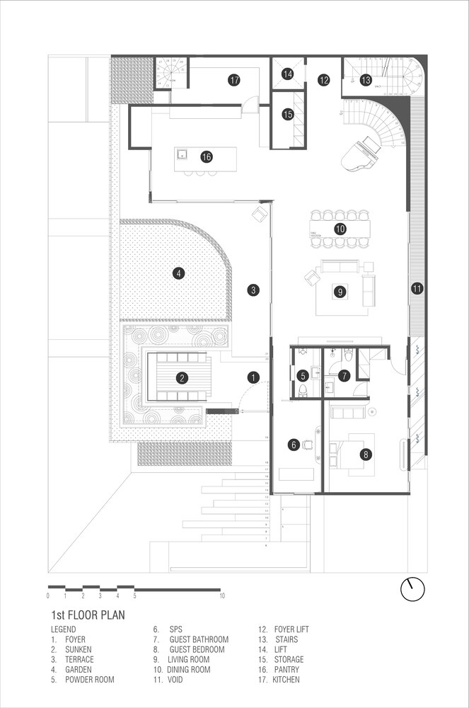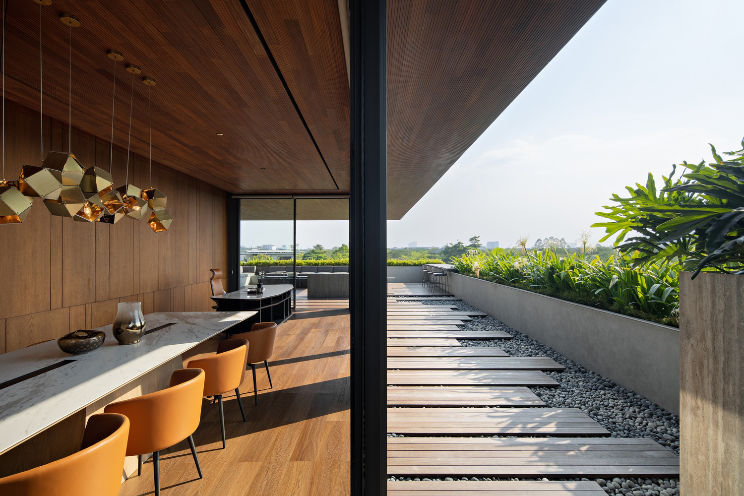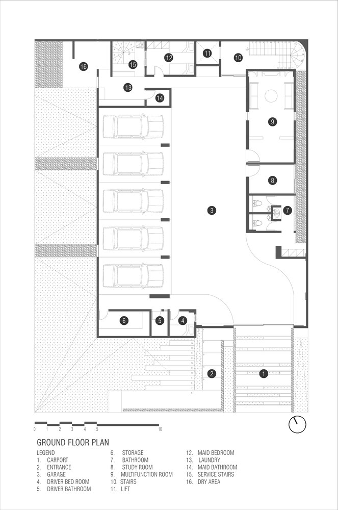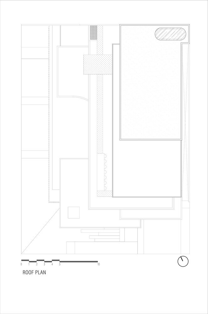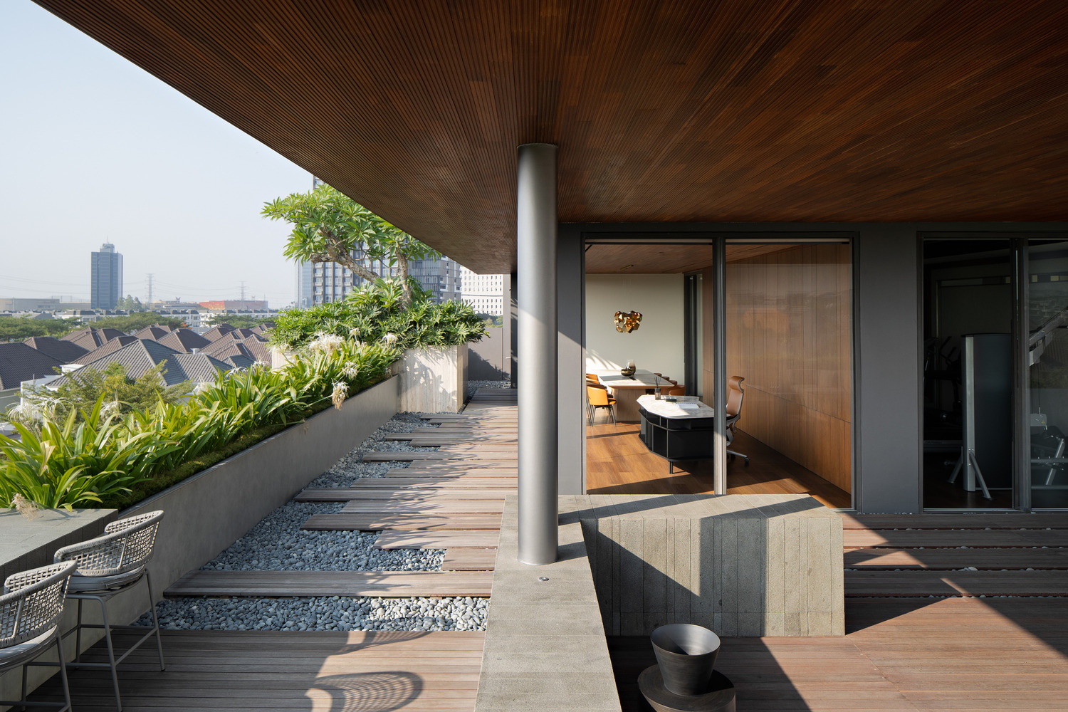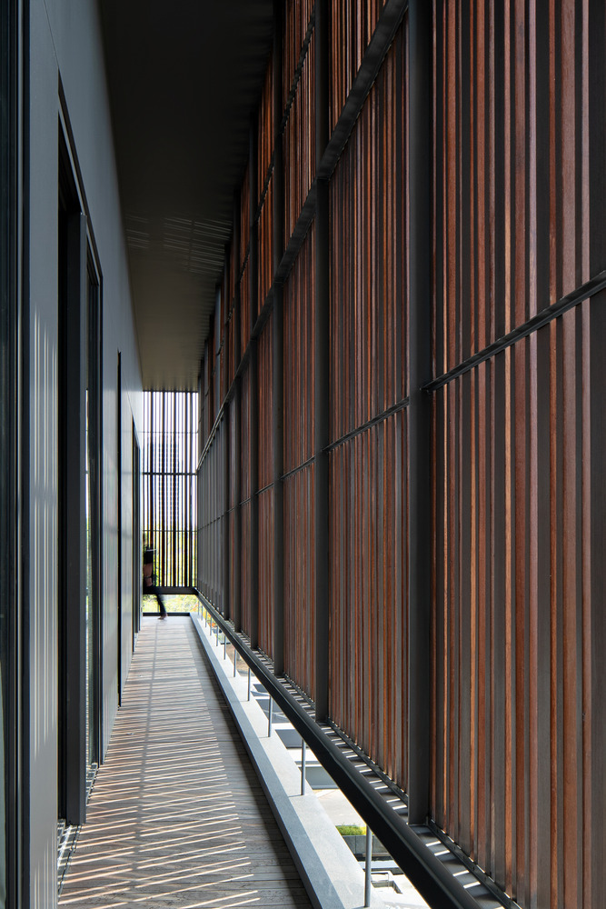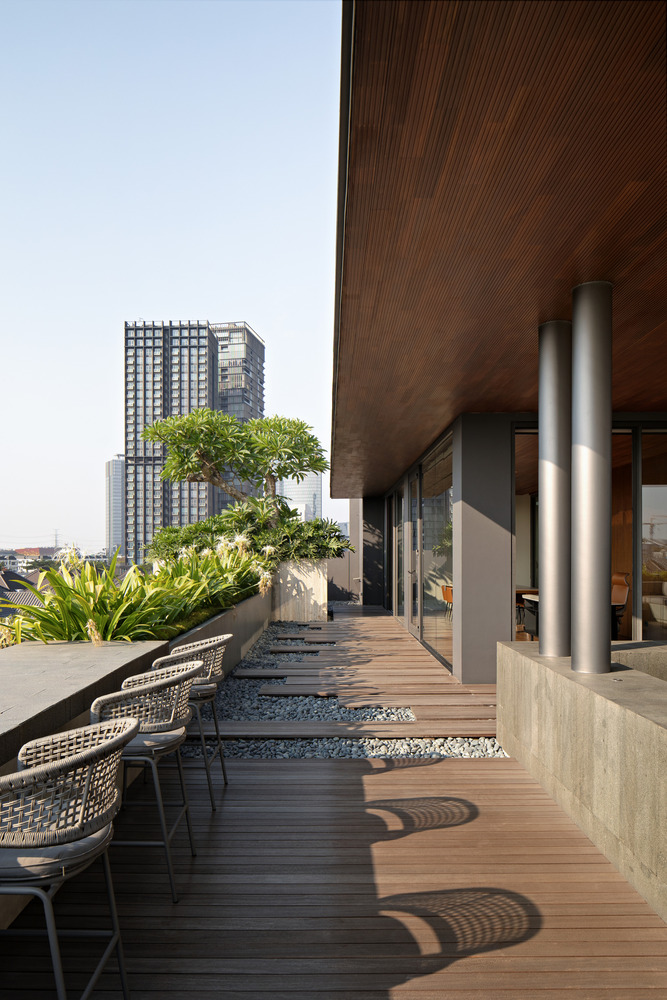 Atop the house, the rooftop is transformed into a multifunctional area, accommodating a workspace and gym. This elevated vantage point provides stunning panoramic views, adding an element of leisure and inspiration to the residence.