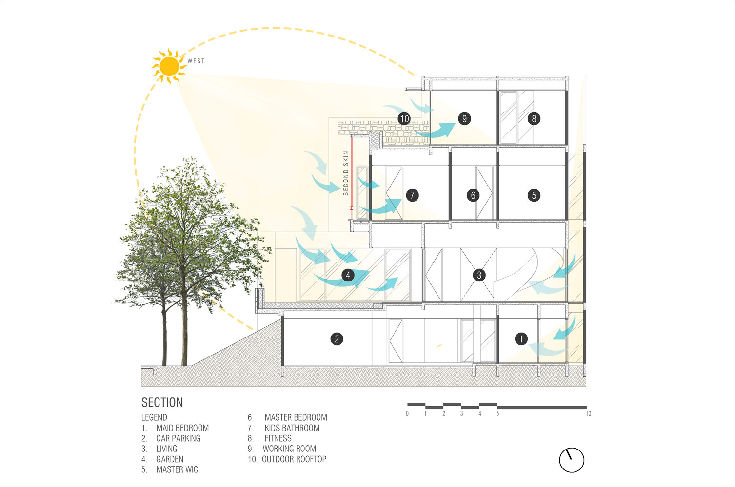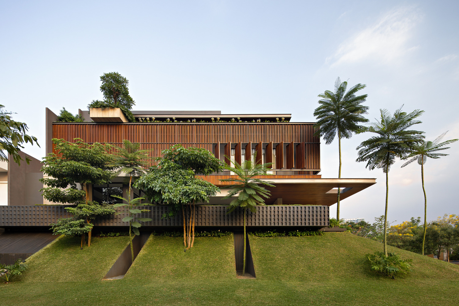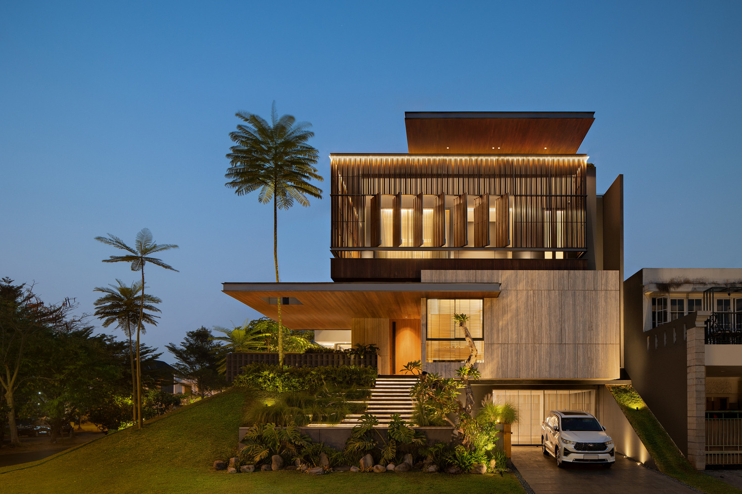 Mentari House stands out as a prime example of sustainable tropical architecture. It incorporates a "second skin" on its western facade, which acts as a dynamic barrier against the harsh sunlight. This feature is not only functional but also adjustable, allowing residents to control sunlight penetration and temperature effectively.