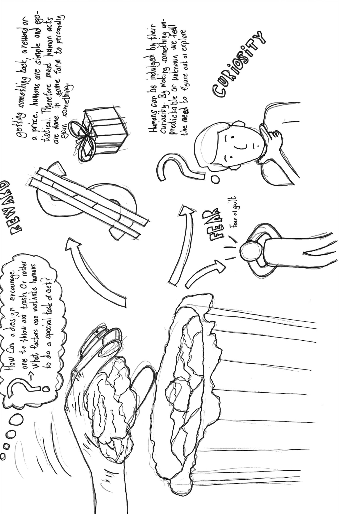 The first challenge I started tackling was how to incentivize action in a person. For this project, the action was disposing of the trash correctly, but the things that are used to incentivize an act can be quite broadly applied. I cut it down to three things, reward, curiosity, and fear. You can see on the drawing described what each point incentivizes and how.