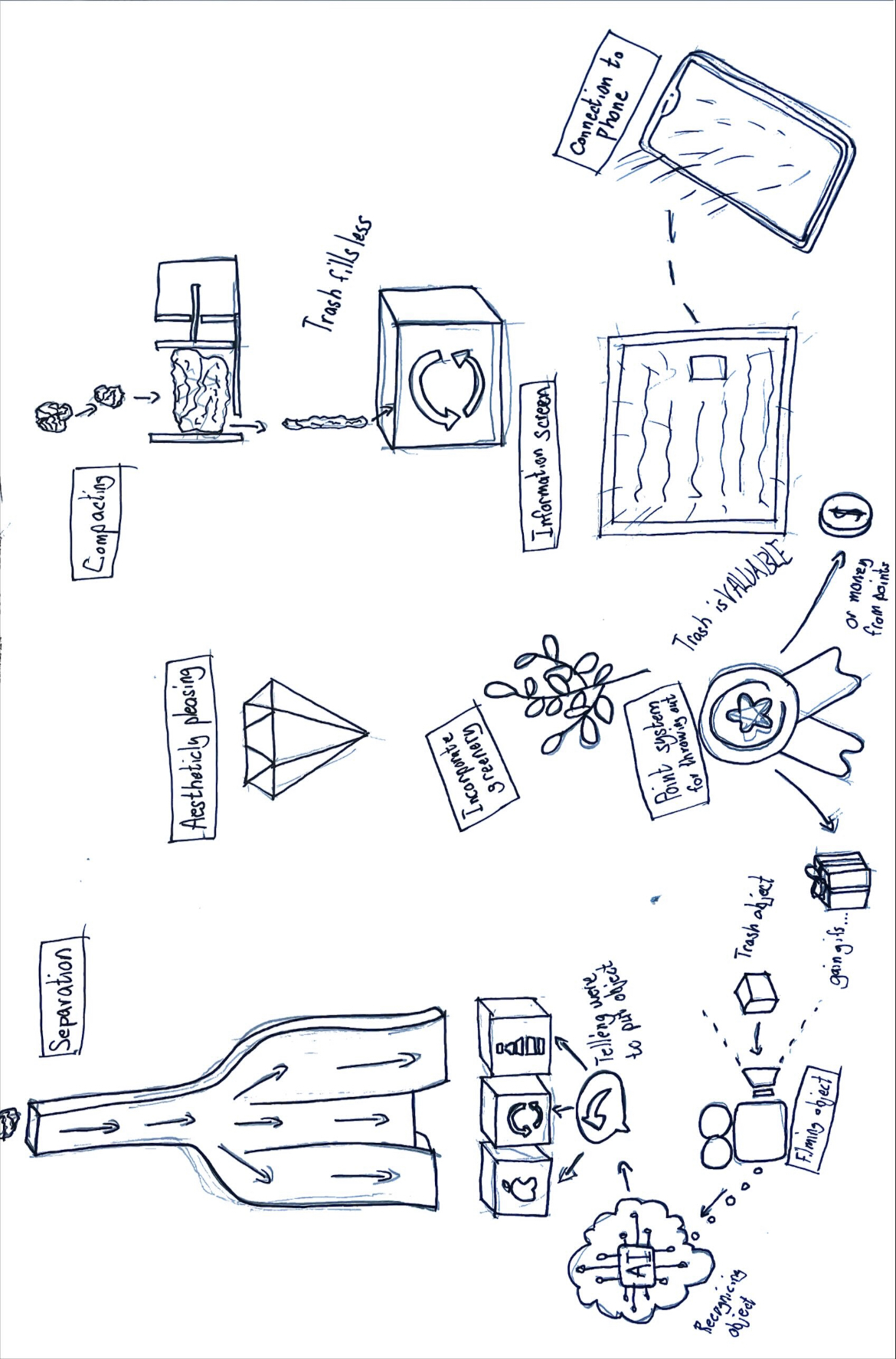 after this, I had gotten a lot of ideas in my head about the general shape of the bin. The shape really births out of the two-section concept, and I just played around with small models and drawings like the above to get to a shape. In the drawing above I also started thinking about the inner functions of the bin and how they should technically be incorporated into the design. I also started getting in on the concept of rewarding the user, pulling all the way back to the first drawing I was talking about: REWARD