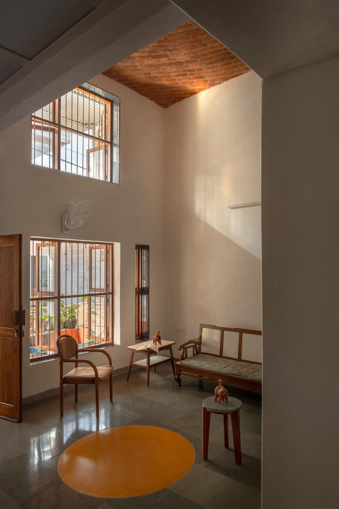The 90-foot linear house with a 17-foot width is intricately planned to suit the dynamics of a village lifestyle. Shared walls foster a strong sense of community, with the otla serving as a communal gathering spot. A grand yet cozy living room adorned with a 15-foot high ceiling and a shallow dome radiates a welcoming atmosphere. Abundant south-facing openings invite natural light, creating a warm ambiance. The strategic placement of the otla promotes interaction among villagers.