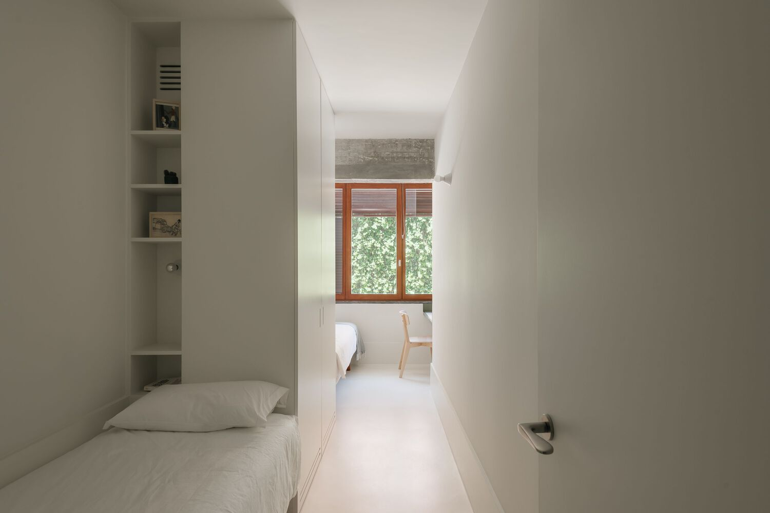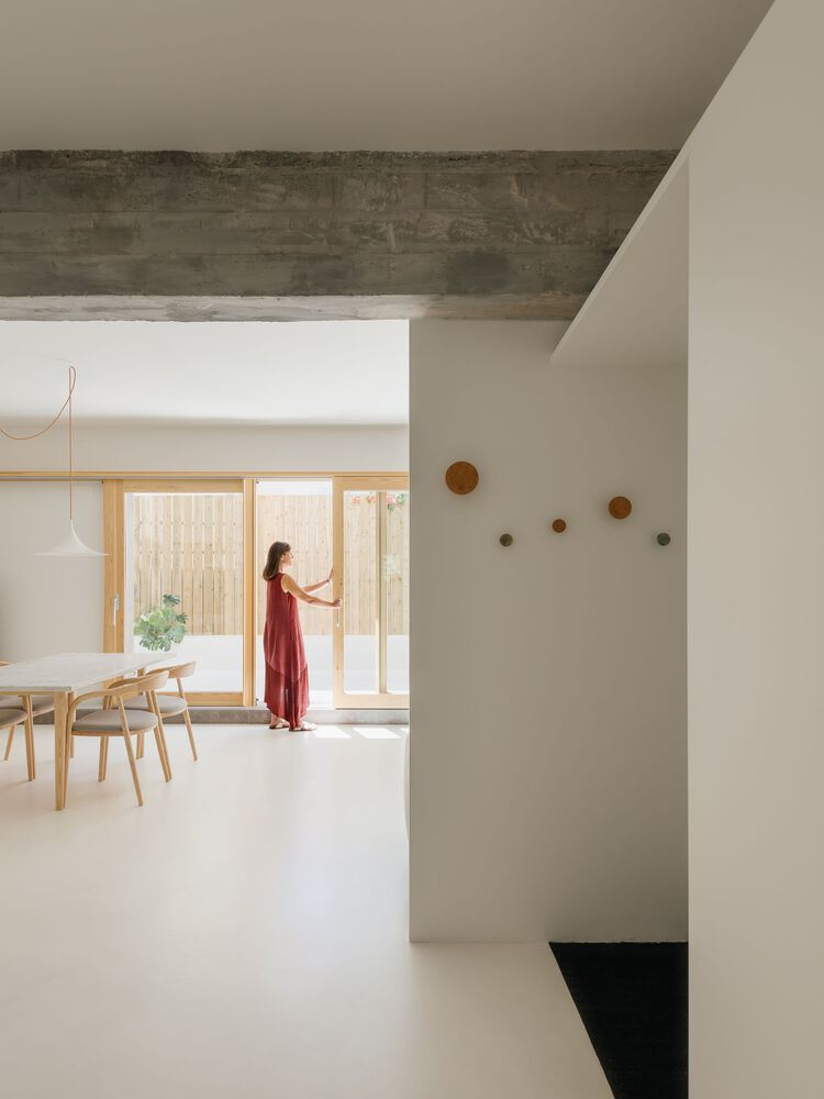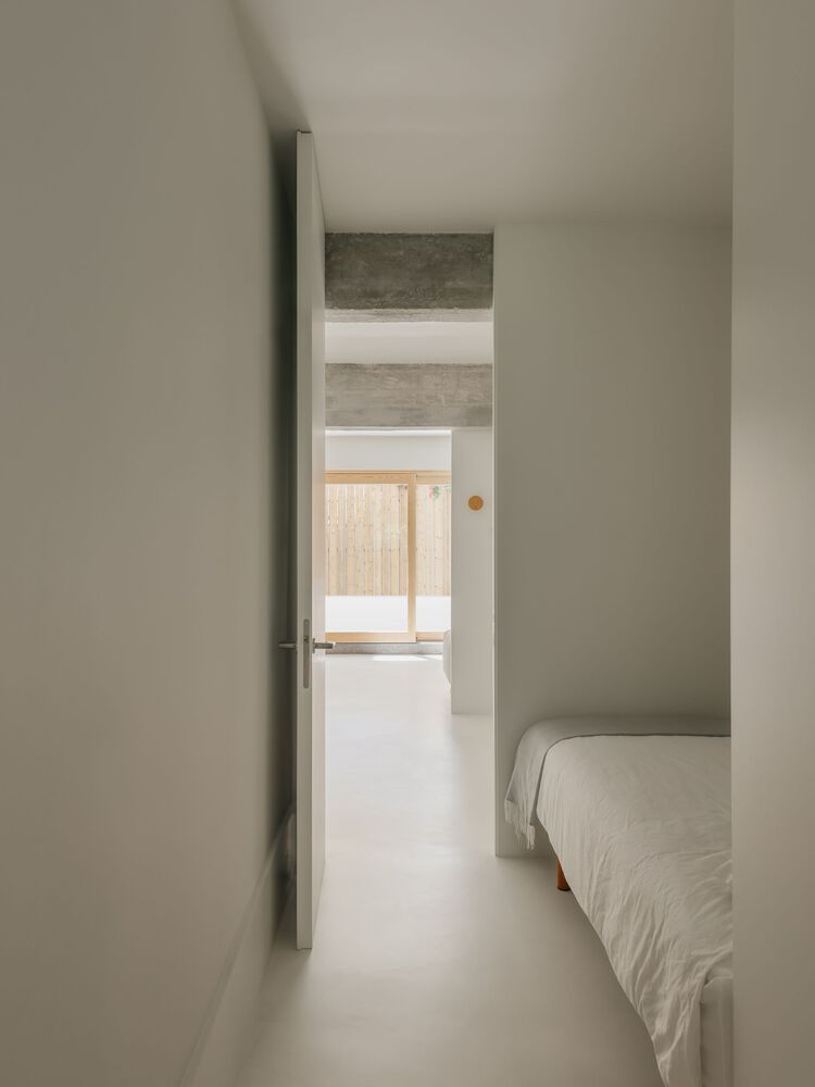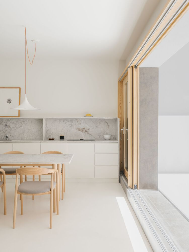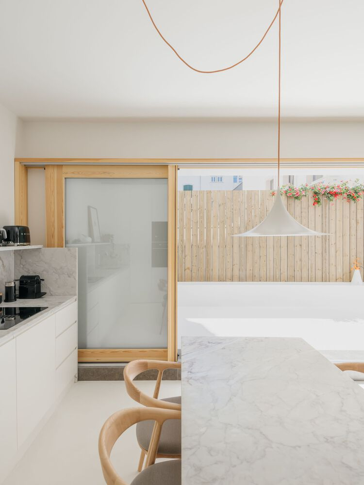 Central to the redesign was the reorientation towards natural light and seamless indoor-outdoor flow. South-facing living areas now open onto a generous terrace, blurring boundaries between inside and outside. Warm white tones and exposed timber windows accentuate the interplay of light and shadow, while raw concrete elements celebrate the building's heritage.
