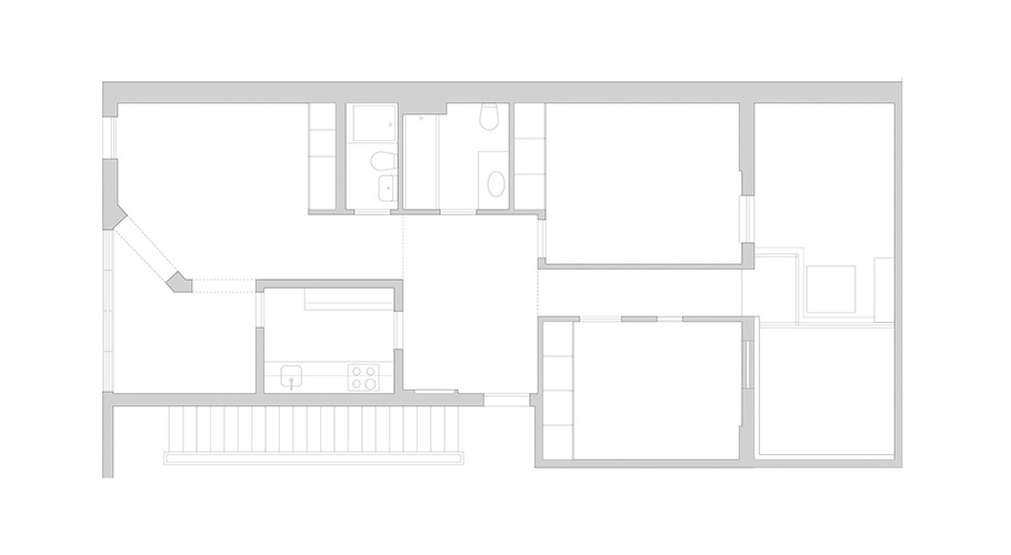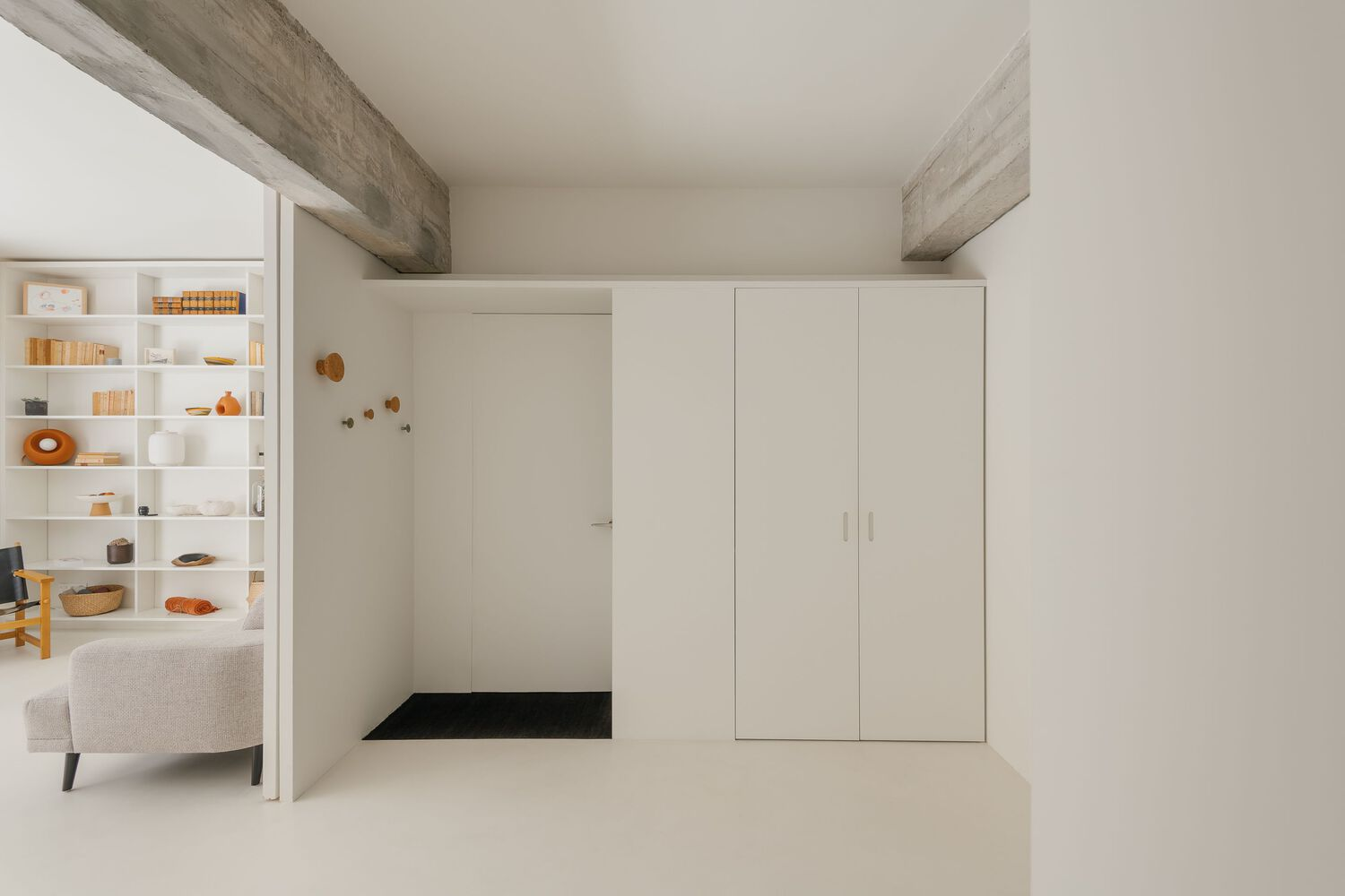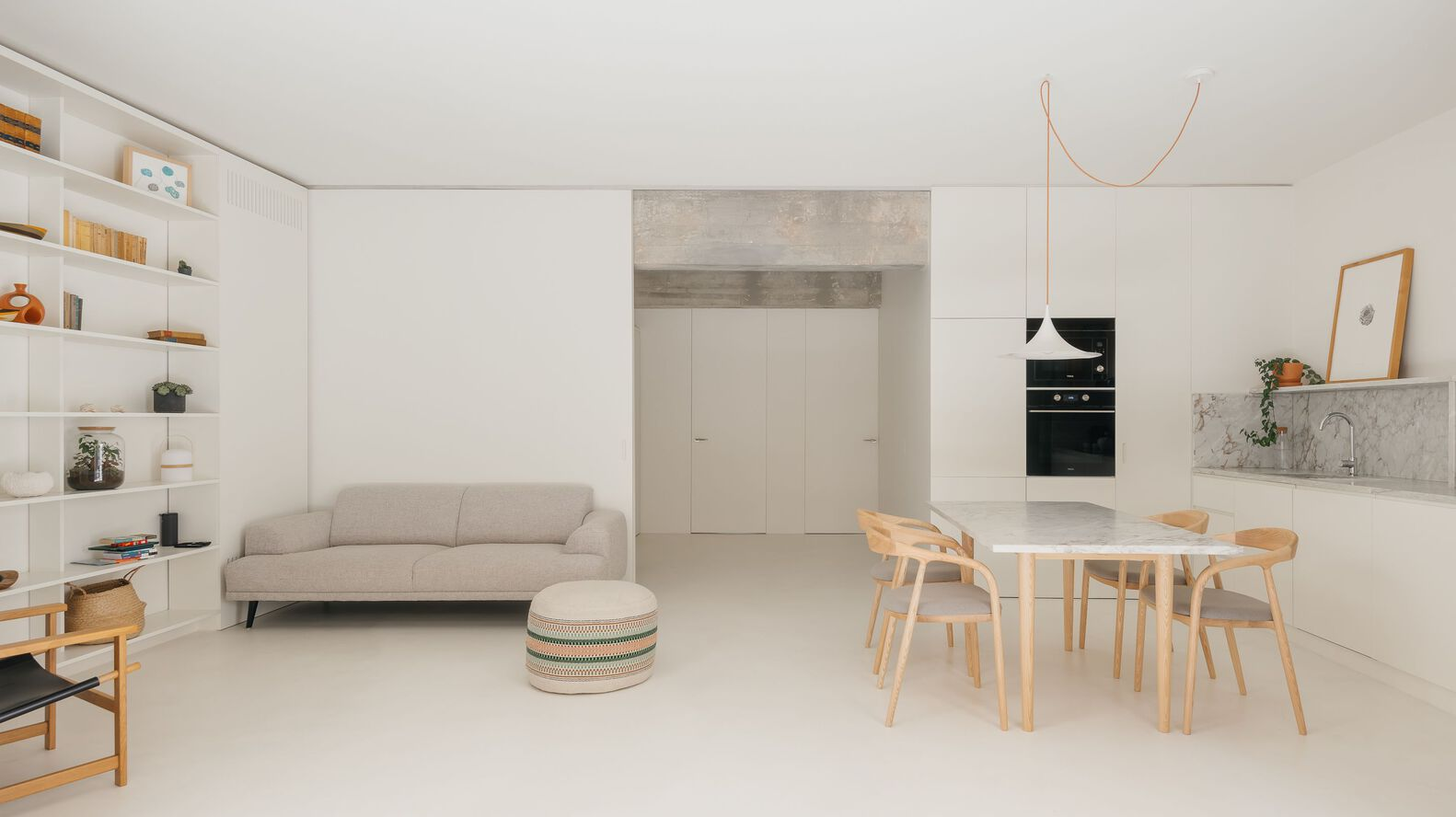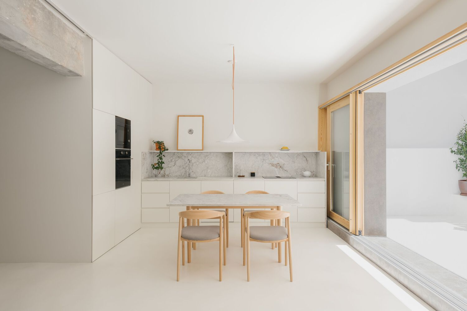 Central to the redesign was the reorientation towards natural light and seamless indoor-outdoor flow. South-facing living areas now open onto a generous terrace, blurring boundaries between inside and outside. Warm white tones and exposed timber windows accentuate the interplay of light and shadow, while raw concrete elements celebrate the building's heritage.