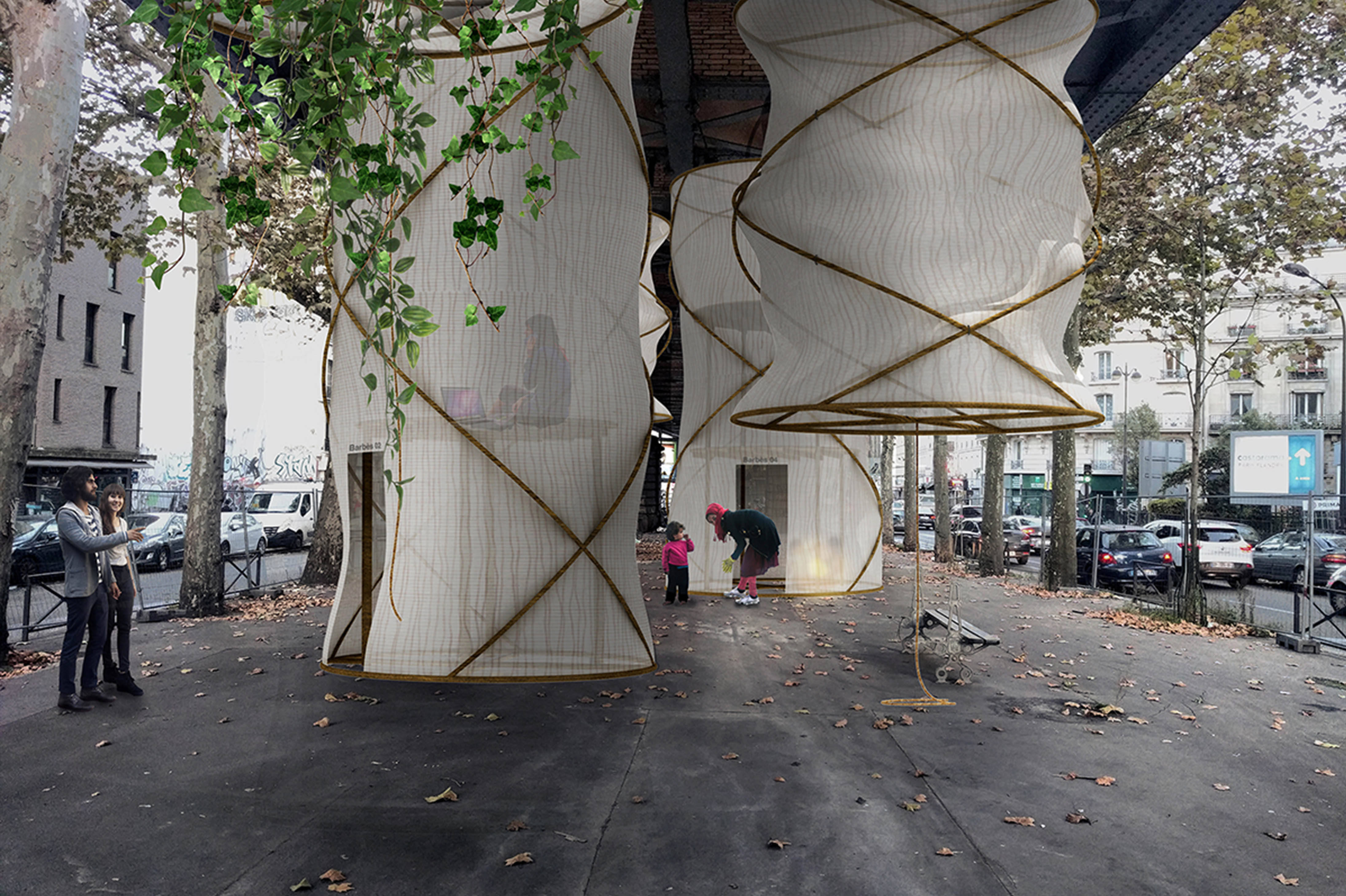 In an attempt to find suitable and safe housing for migrants coming to the city, this collaborative project is a public park beneath an elevated railway bridge. Accommodating basic functions like playground, performance space and a public park, these are cylindrical canopy structures. The 4 meter-wide and 7 meter-tall installations are composed of recycled transparent polypropylene canvas as its sheathing and coil spring bamboo tubes as the framework. This public installation has aimed to provide cultural exchanges and collective activities by reclaiming underutilized public spaces.